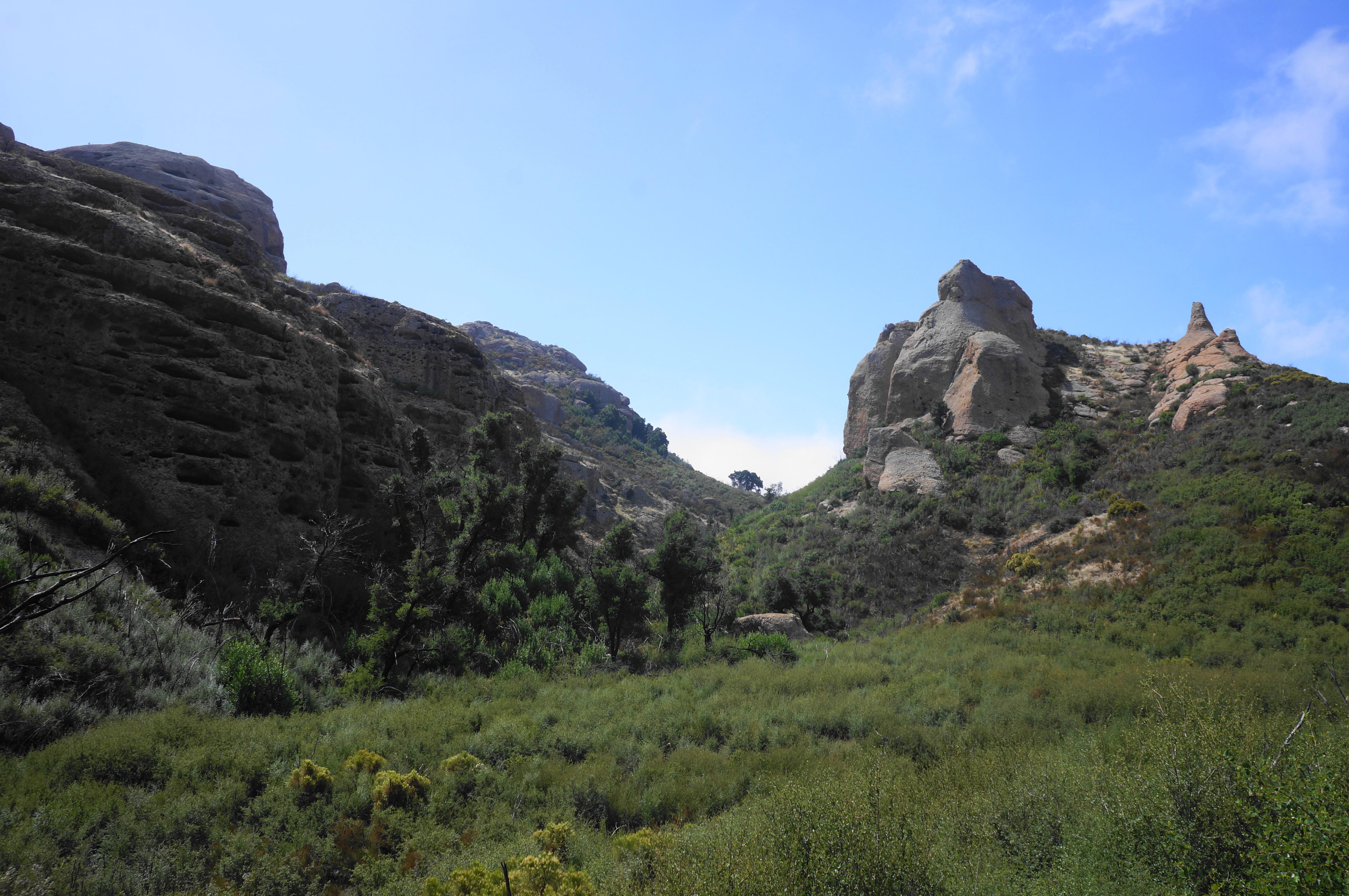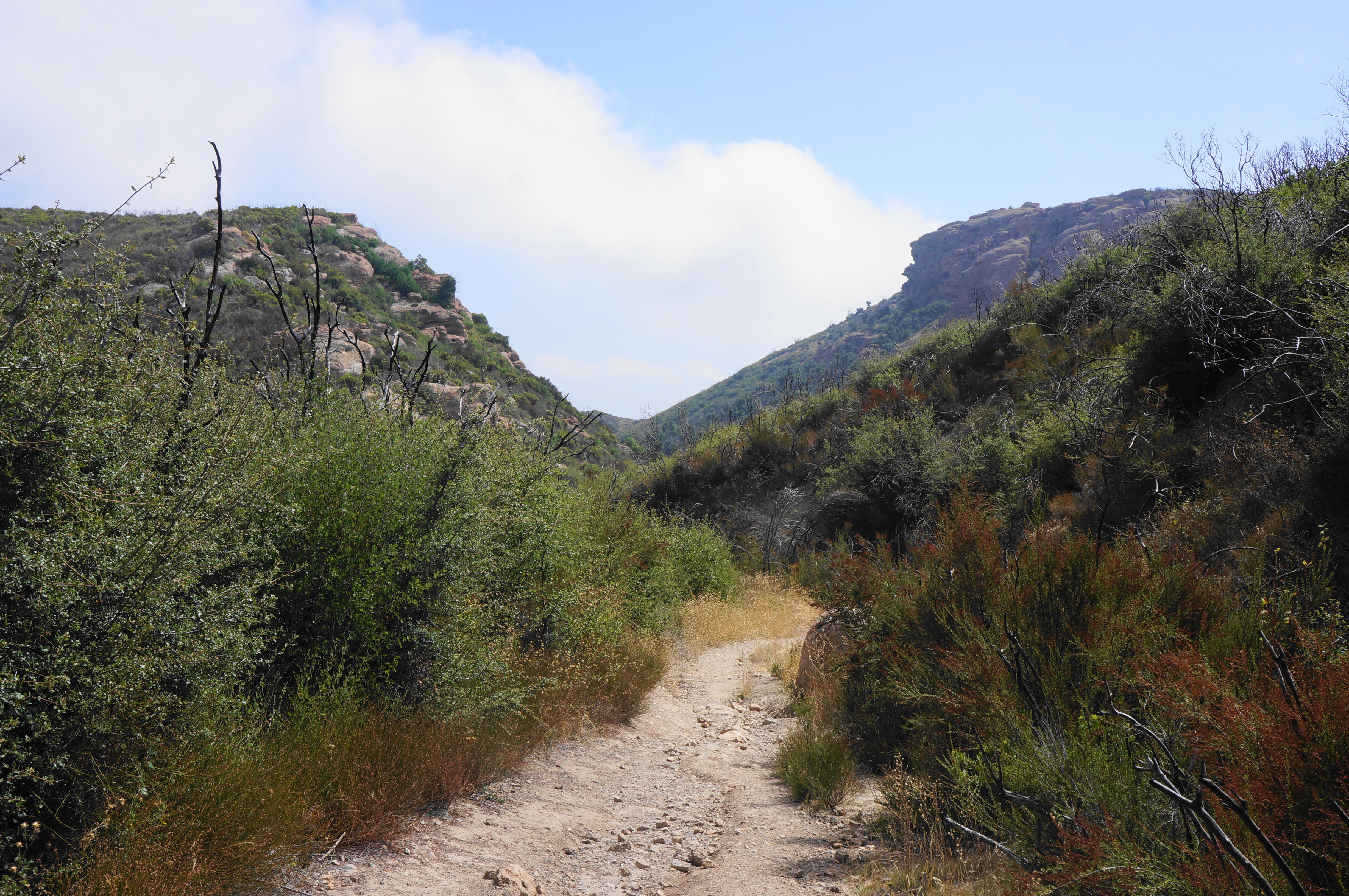 As the track files down-canyon, the surrounding canyon walls and outcrops appear larger and more imposing, and the trail eventually shifts from the right side of the wash to the left. Enjoy the mellow downhill as the path drops to a stand of charred oaks, evidence of the recent Woolsey Fire, which ravaged much of the park in 2018. Pass a spur trail heading left to Balanced Rock (you will see it later from the other side of the canyon), then drop to another drainage crossing at Split Rock, a shady picnic area named for a modest boulder with a cleave down the middle.