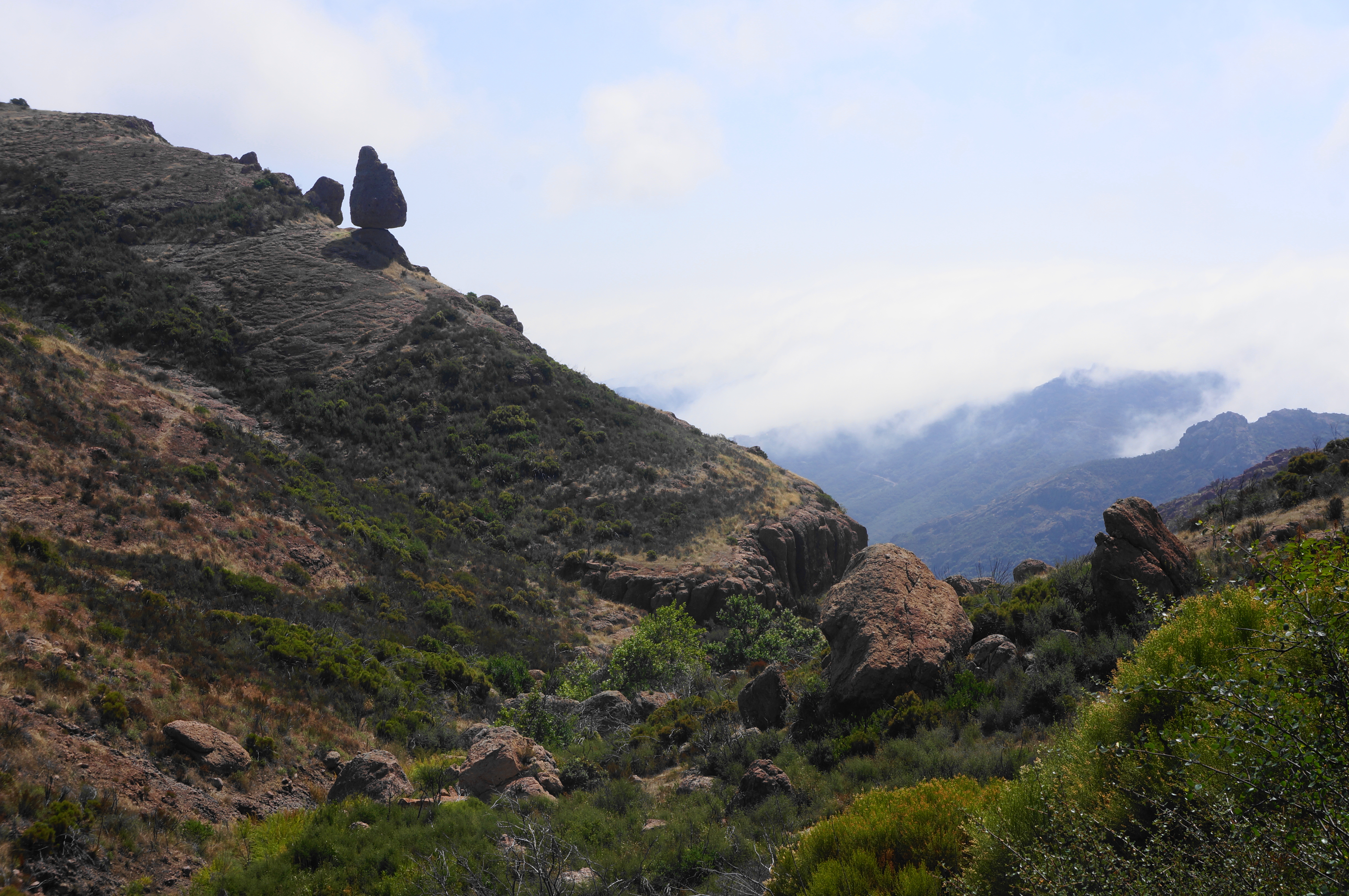 From Split Rock, the onward trail climbs to heights overlooking Carlisle Canyon as it approaches the Echo Cliffs and drops down several hundred feet in quick succession. The guardian of this transition is the impressive Balanced Rock, viewed from a distance but unmistakable as an towering sentinel, one of the most distinguished natural landmarks of the Santa Monica Mountains.