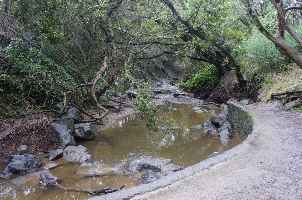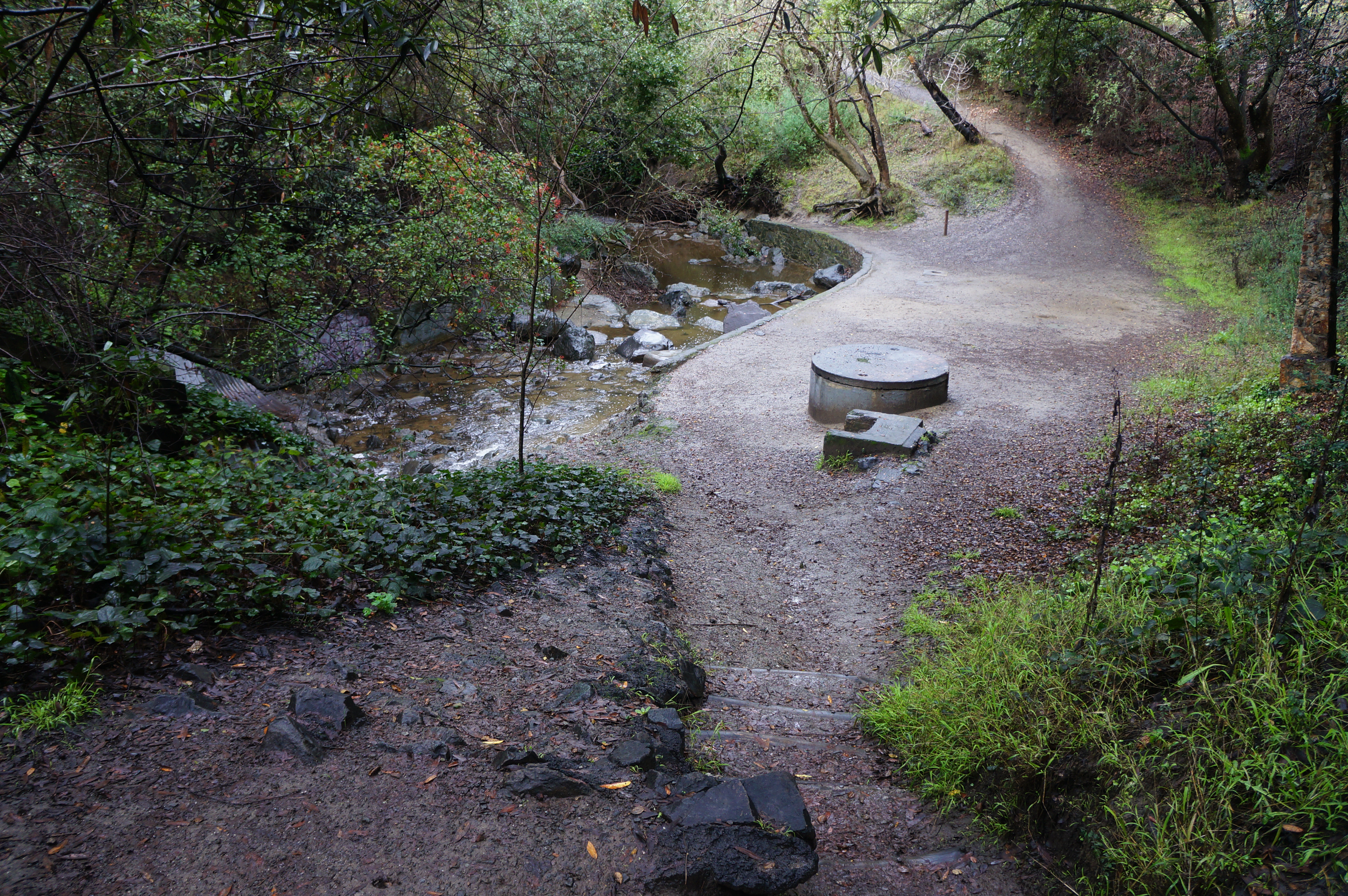 The oldest part of Wildcat Canyon, Alvarado Park, was initially a private park (first called Grand Canyon Park before it was renamed in 1926), served by its own streetcar line from 1909. Later, it was acquired by the City of Richmond and absorbed into neighboring Wildcat Canyon Regional Park. The 42.5-acre unit features stonework dating to the Great Depression, as well as a modern picnic area, playground, and maze of interlocking trails, zig-zagging through the Wildcat Creek drainage and the eucalyptus-dotted hillside. The initial trio of trails described below explore this small unit, enough to entertain for a few hours to a half day.