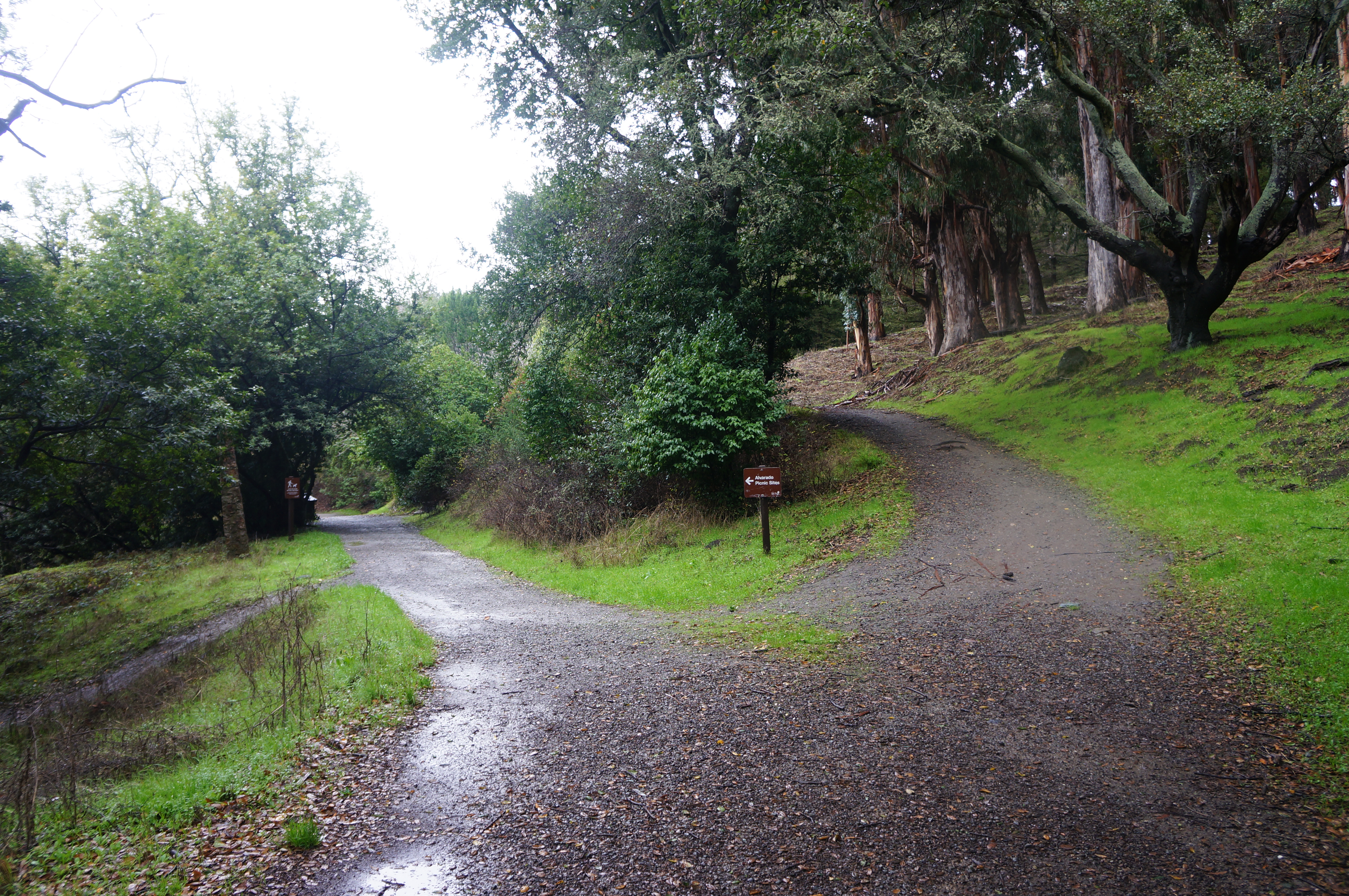 This more challenging option weaves through the web of interlocking trails below a canopy of eucalyptus, with peeks of views to the broader Wildcat Canyon area. Take the wide path heading uphill from the west end of the parking area, entering the eucalyptus grove and bearing left. Stay left at the next two forks, then bear right just before the main track turns to pavement. Bear west on the shady path and take a hard right at the next junction, rising almost to the yellow house at the park boundary. From here the track bears east, paralleling the fenceline and narrowing as it bobs up and down through the eucalyptus stand. Stay on this trail until a junction at 7/10 mile with some limited views south and east to San Pablo Ridge and Wildcat Canyon. Bear right and descend sharply back to the initial junction, then head left to descend to the start.