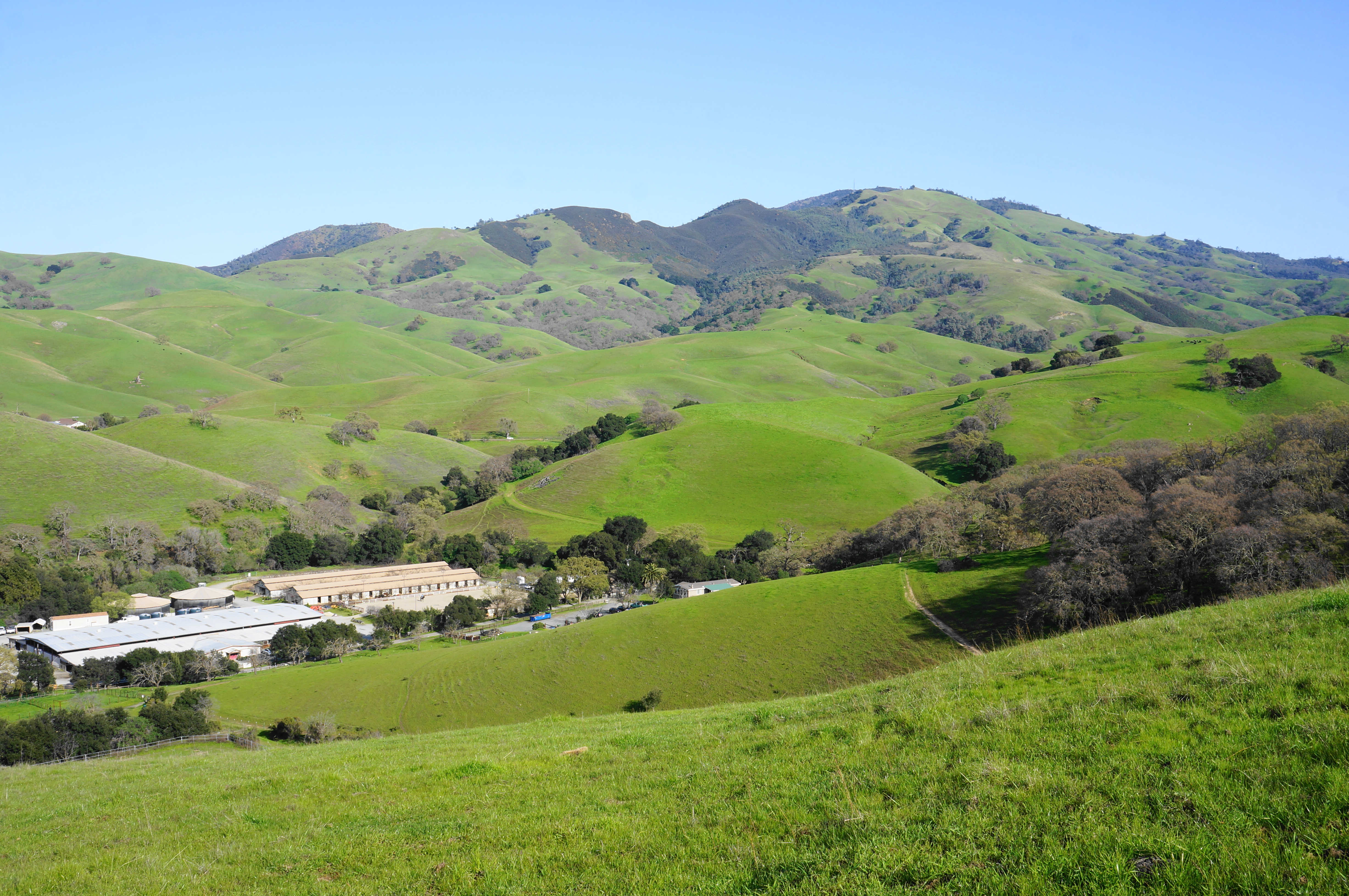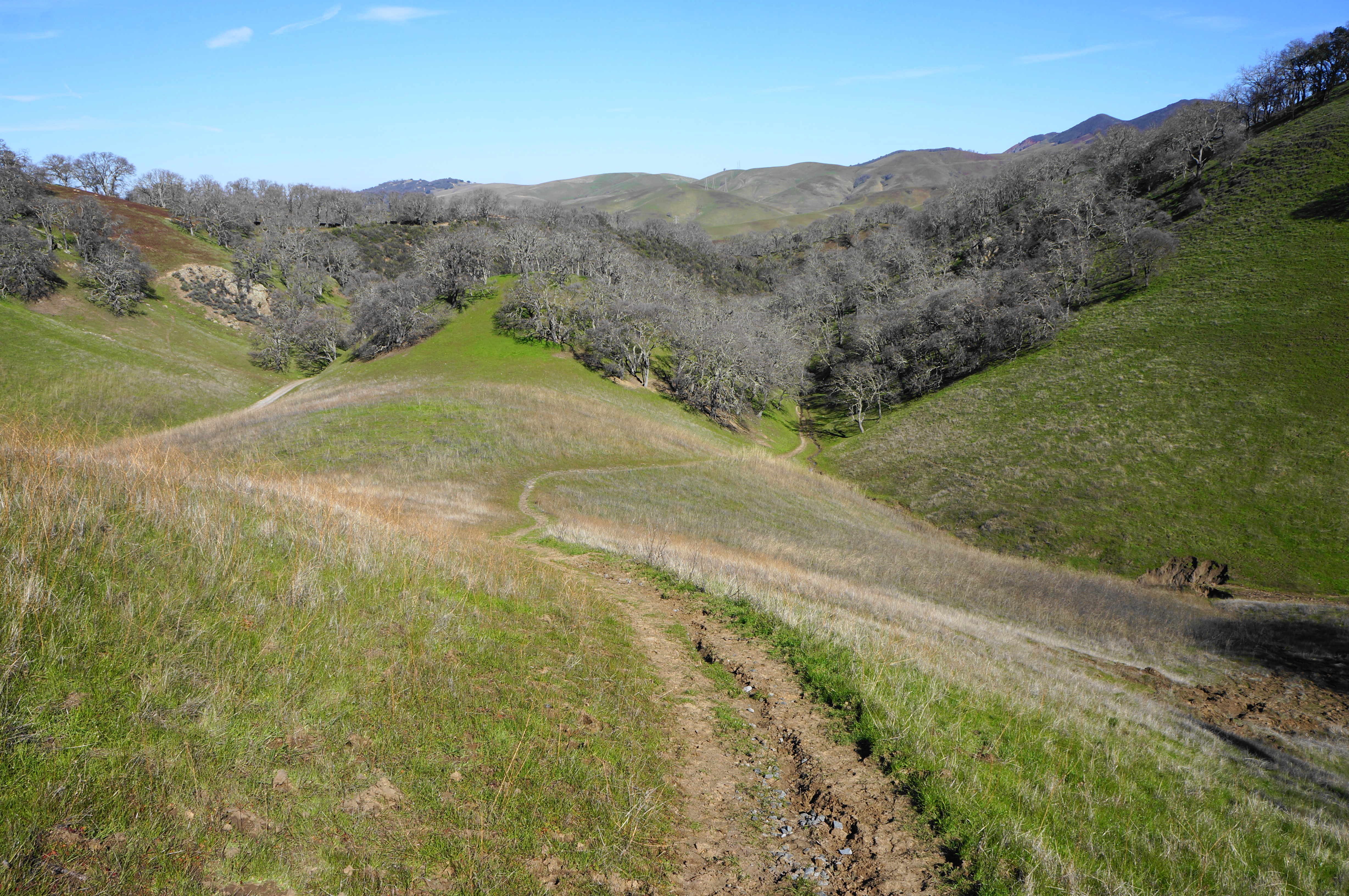 Entering the park from the west, this alternative route climbs Shell Ridge from Old Borges Ranch, traversing several ups-and-downs over the course of a scenic 2.5-mile trek. From the parking at Old Borges Ranch in the adjacent Shell Ridge Open Space, head north on the grassy Borges Ranch Trail, bearing right to descend to Bob Pond and Hanna Grove Picnic Area. Cross the street, finding a thin trace—appearing as little more than a cattle track—which parallels the road and enters Diablo Foothills Regional Park. Eventually the narrow track widens and climbs away from the road, ascending to a junction at 4/10 mile; stay right, ascending further to Shell Ridge. Bear right on the Shell Ridge Trail, rising to heights overlooking Pine Canyon. Then bear left at the next junction, dropping and rising again, before taking the Shell Ridge Loop Trail left down into a secluded gully. Stay left, then take the next two rights, following the wide, old ranching track to Portuguese Gap. Pass through the gate, reentering Shell Ridge Open Space, skirt Buckeye Hill, and take a right at the final junction, descending to the trailhead.