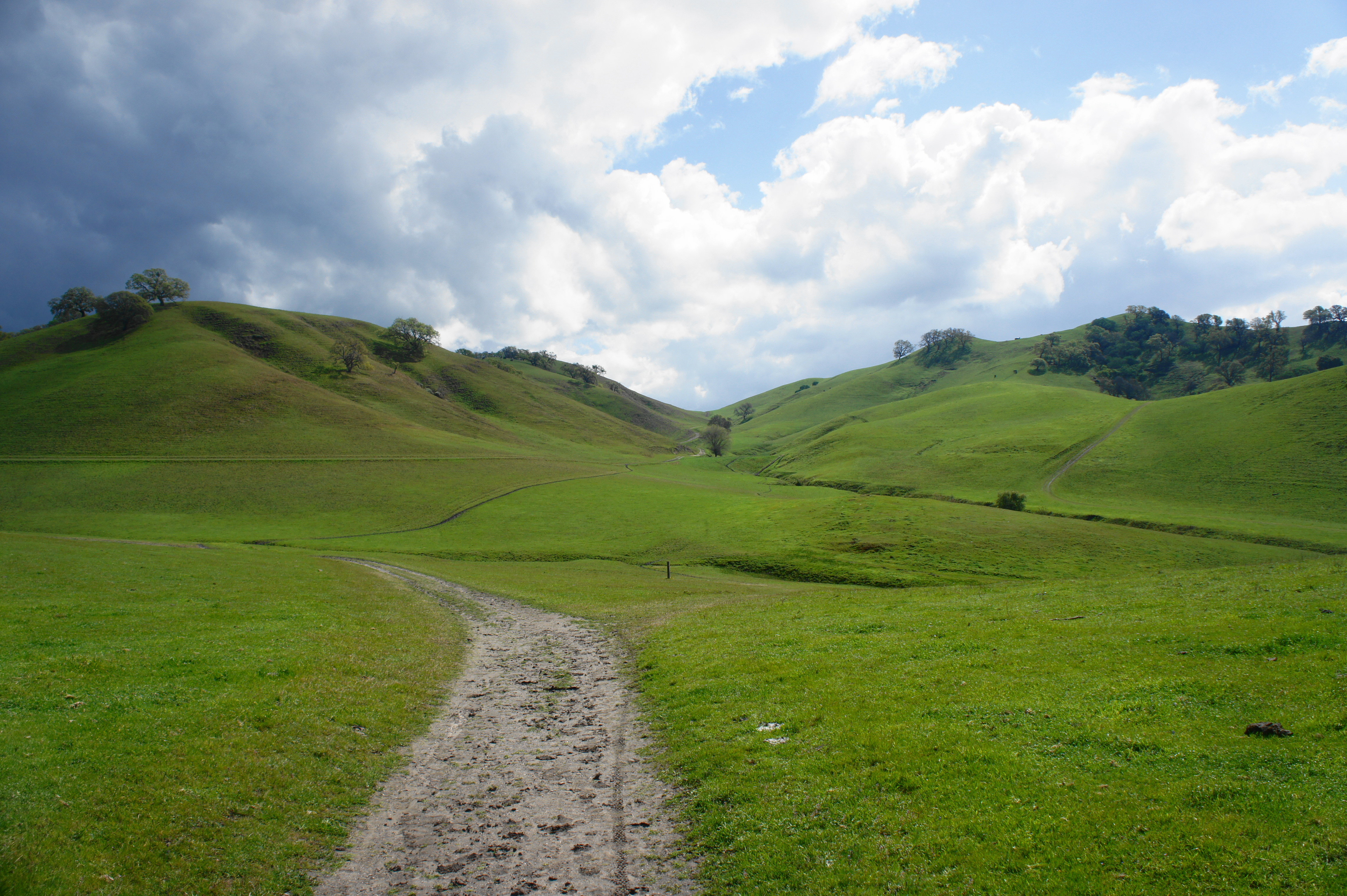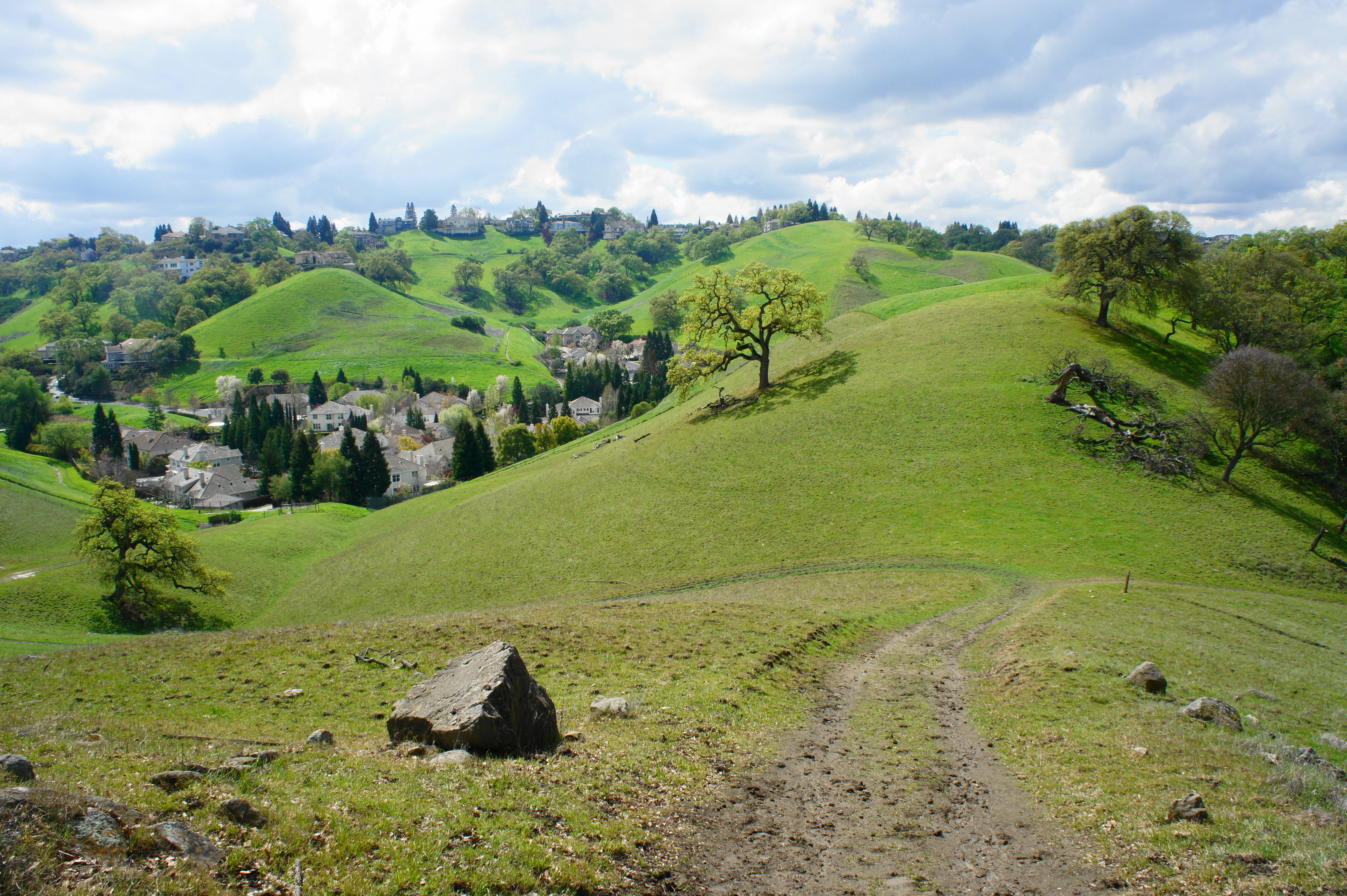 This outstanding loop, easily accessible from suburban Alamo, traverses similar territory as the Hazard Hill hike above but adds a scenic stretch through the heart of Diablo Foothills Park. Starting from the Livorna Staging Area, follow the Foothills Trail for 4/10 mile, rising to an open hillside with terrific views of Mount Diablo, Las Trampas, and the Briones Hills. Stay on this path as it ascends to clear a high ridge, then drops to a junction at 8/10 mile. Stay right, climbing again, before dropping again to another junction at the one-mile mark. Stay straight on the Foothills Trail, then wind around to the north side of an EBMUD water tank and descend into a beautiful, secret valley surrounded by elegant hillsides. Follow the Twin Ponds Trail down into the valley, then continue straight on the Hanging Valley Trail, which climbs steeply to a ridgeline at mile 2. From here, drop into a picturesque ravine (aside from the mud and cow droppings), bearing left at the fork at 2.25 miles. From here, follow the Alamo Trail, which follows a small valley wedged between subdivisions, for nearly a mile back to the staging area.