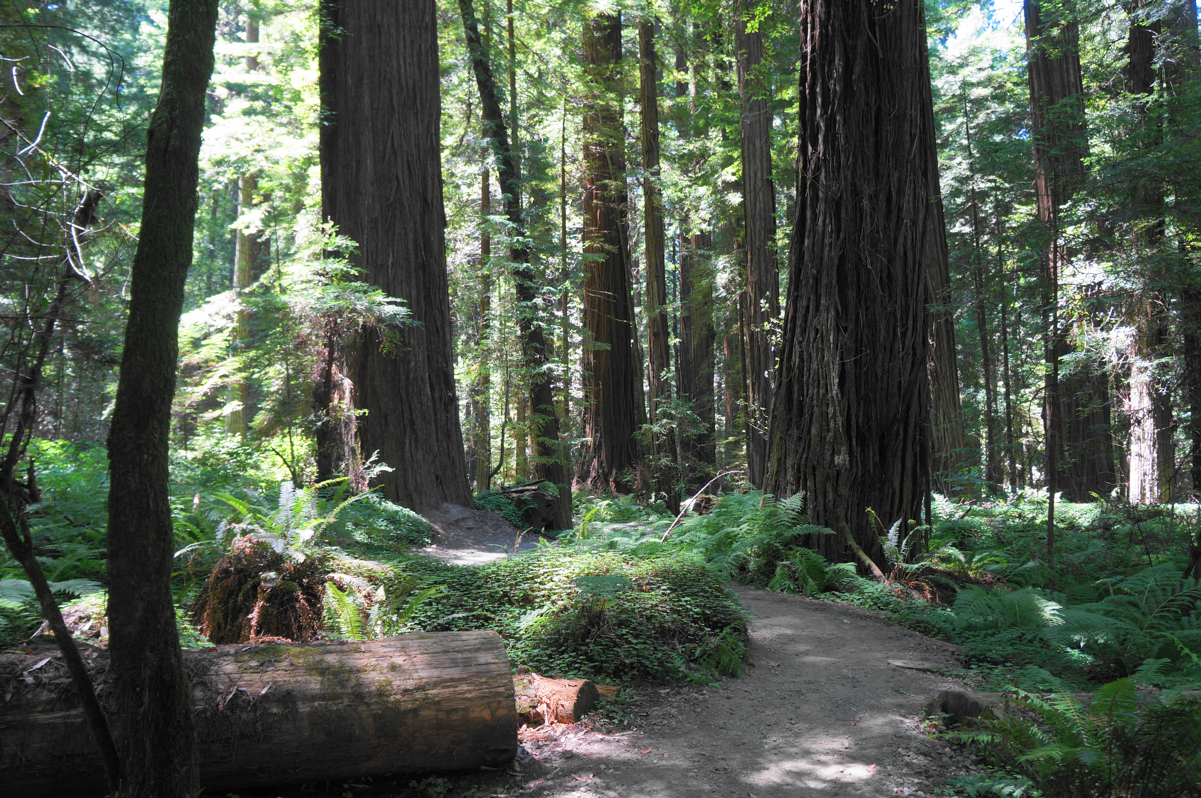 The trail, partly asphalted, traverses an entry brushland before quickly entering the dark and dense forest, where the redwoods are visible right away. New and old growth are interspersed as the trail rounds an S-curve, with the ferns soon overtaken by a lush carpet of clover-like redwood sorrel. Visitors, enamored with the showy landscape, are likely to slowly make their way through the hike, stopping to take photos whenever the light and scenery changes.