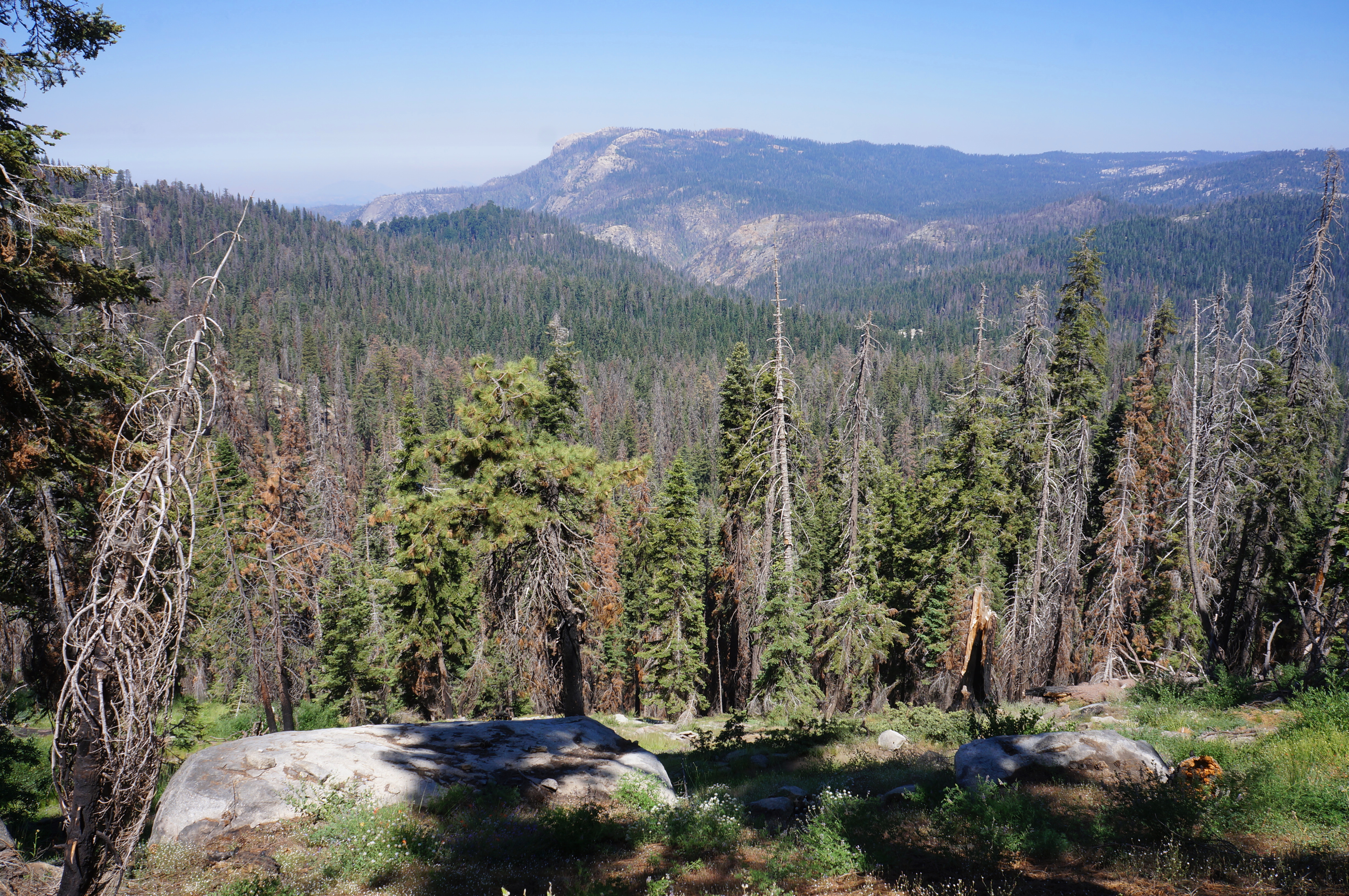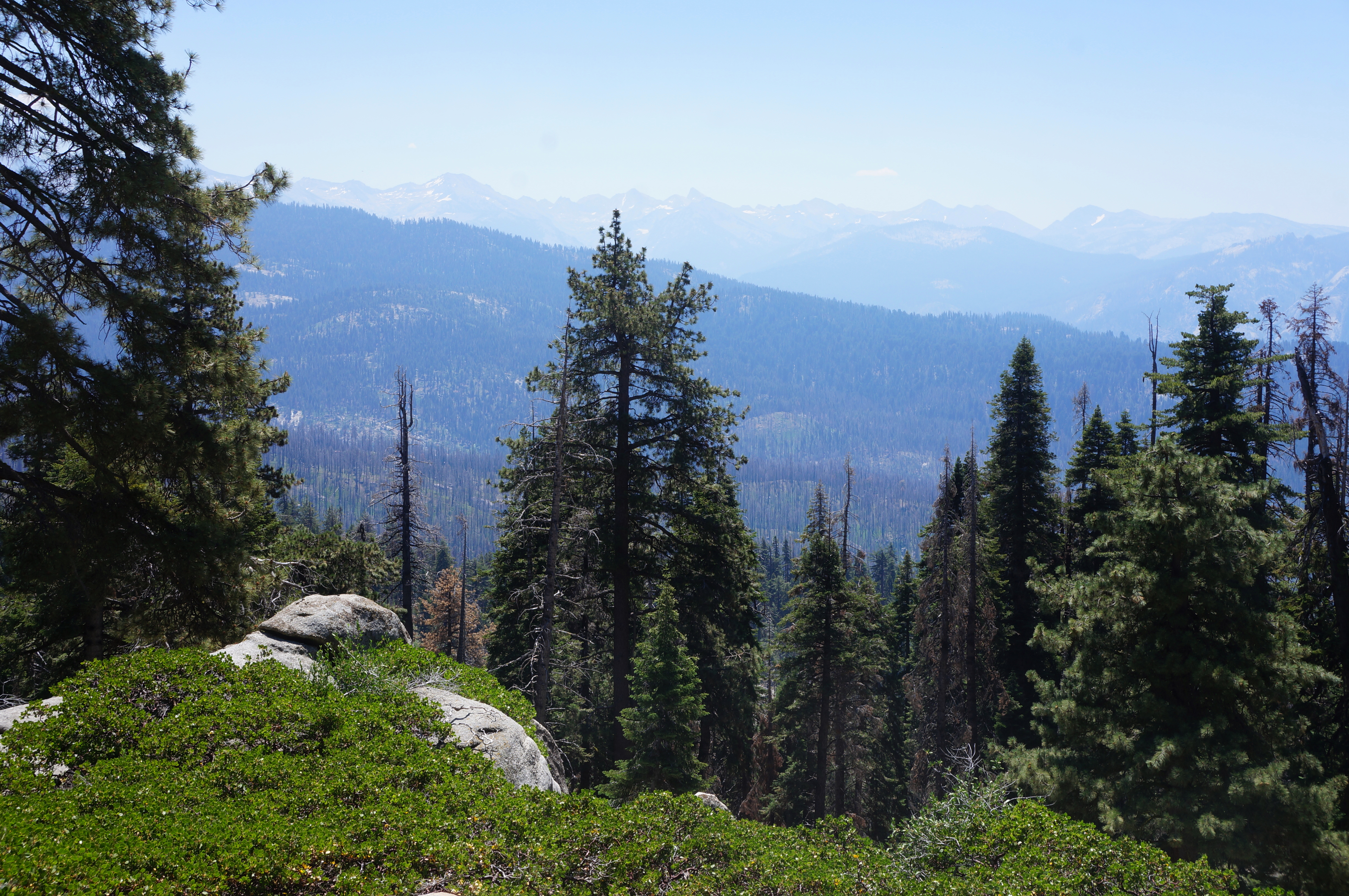 A short uphill involves skirting a smaller granite hump on the left, then the trail comes out onto an east-facing flank with the hike’s first wide-reaching views to the mighty Great Western Divide, a series of 12- to 13,000-foot peaks that bisect Sequoia National Park (concealing the even taller High Sierra and Mount Whitney beyond). One can also see east to Mount Silliman, Alta Peak, and the Kings-Kaweah Divide, which spans the boundary between Sequoia and Kings Canyon National Parks.