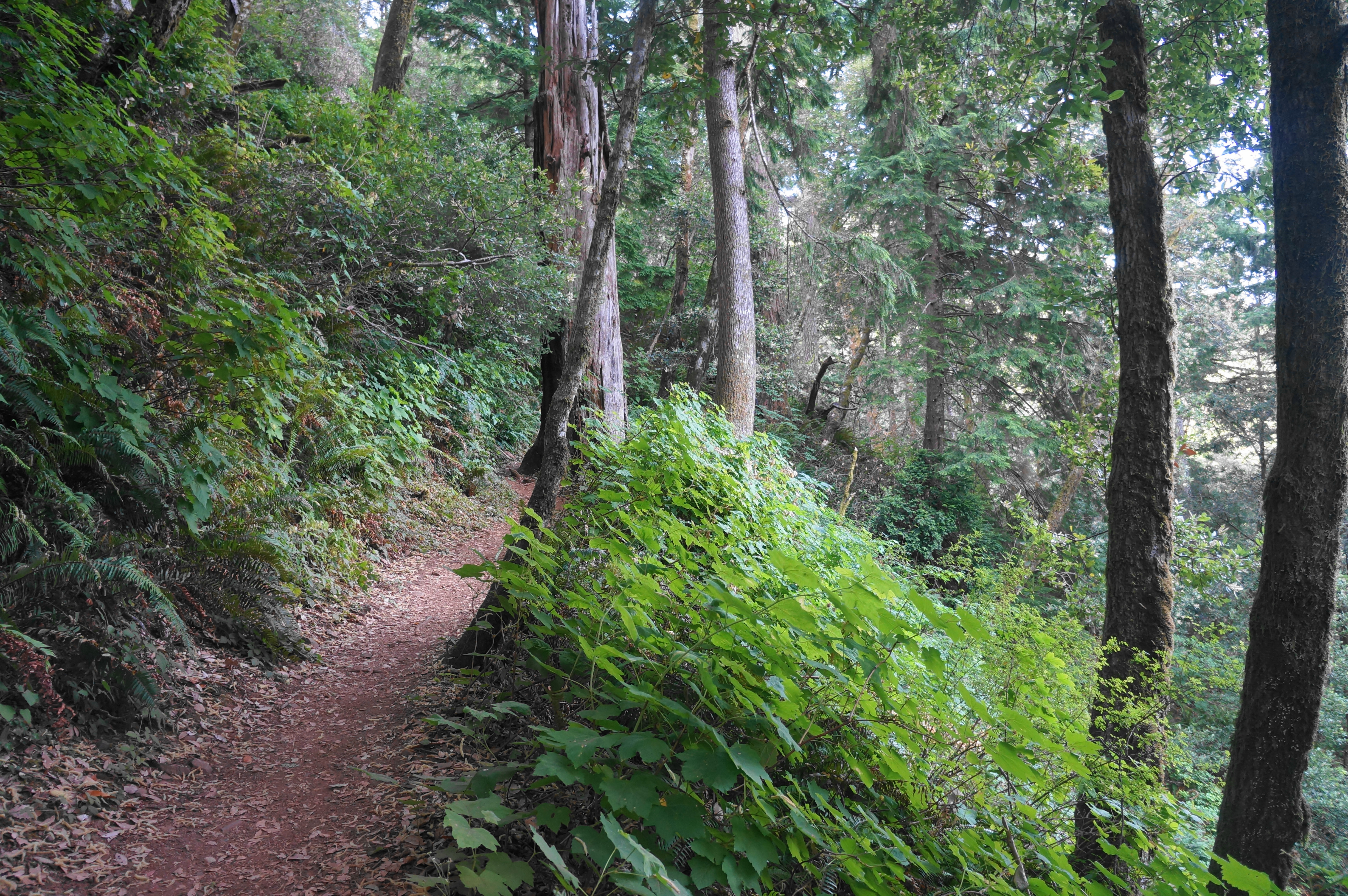 Cross a seasonal, fern-lined stream, then begin to climb sharply up to the left. Walk through a dense mixed forest of bay laurel, oak, maple, and Douglas fir, with a variety of ferns—including five-finger (maidenhair)—blanketing the north-facing slope. Some limited views of the valley formed by Brush Creek come into shape at around 2/10 mile. Head into a set of two wiggles, then pass the ¼-mile marker, followed by a steep incline and a right-hand switchback. With the trail now heading back westward and south, hikers can see a bit of the ocean to the northwest.