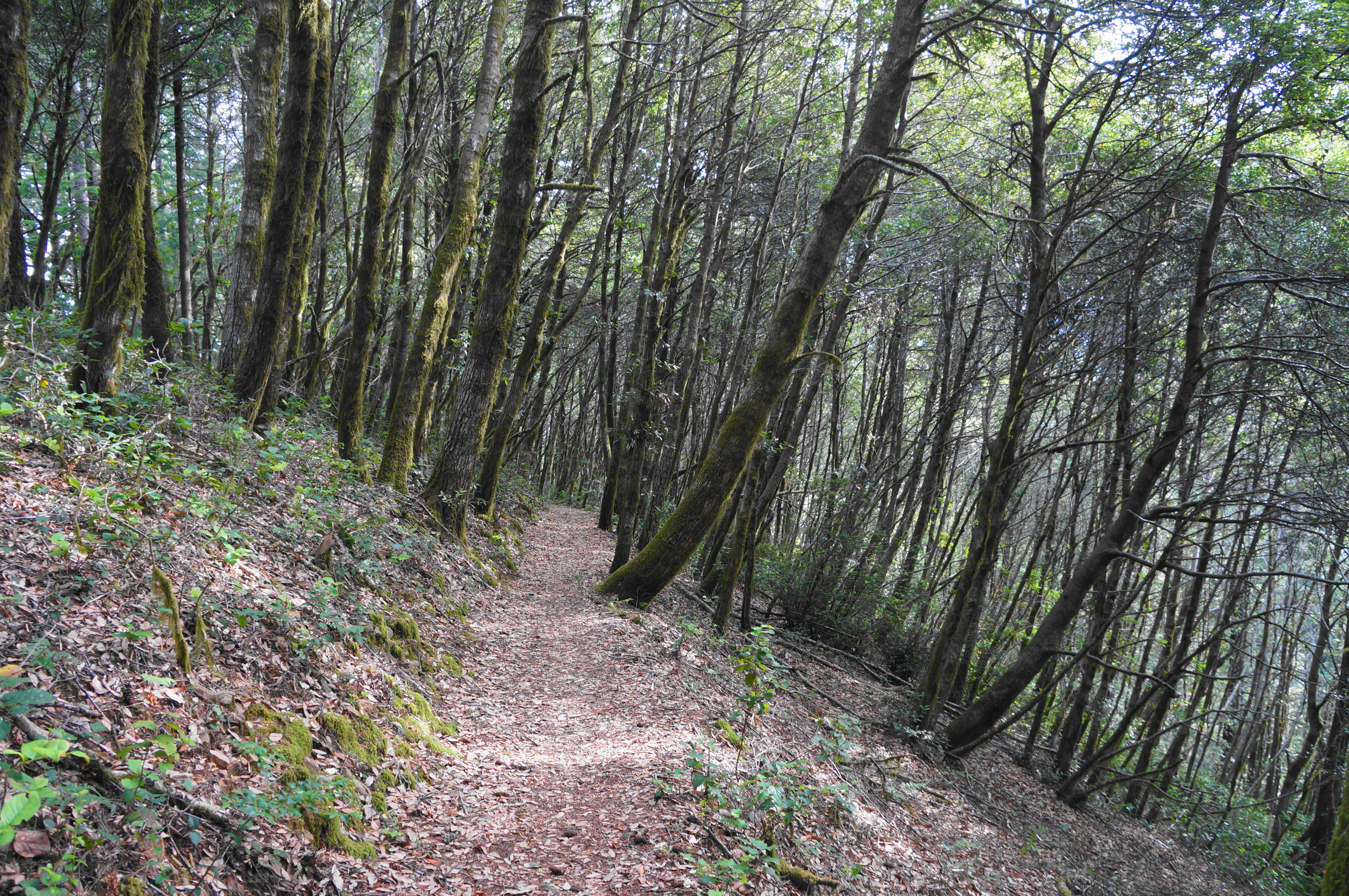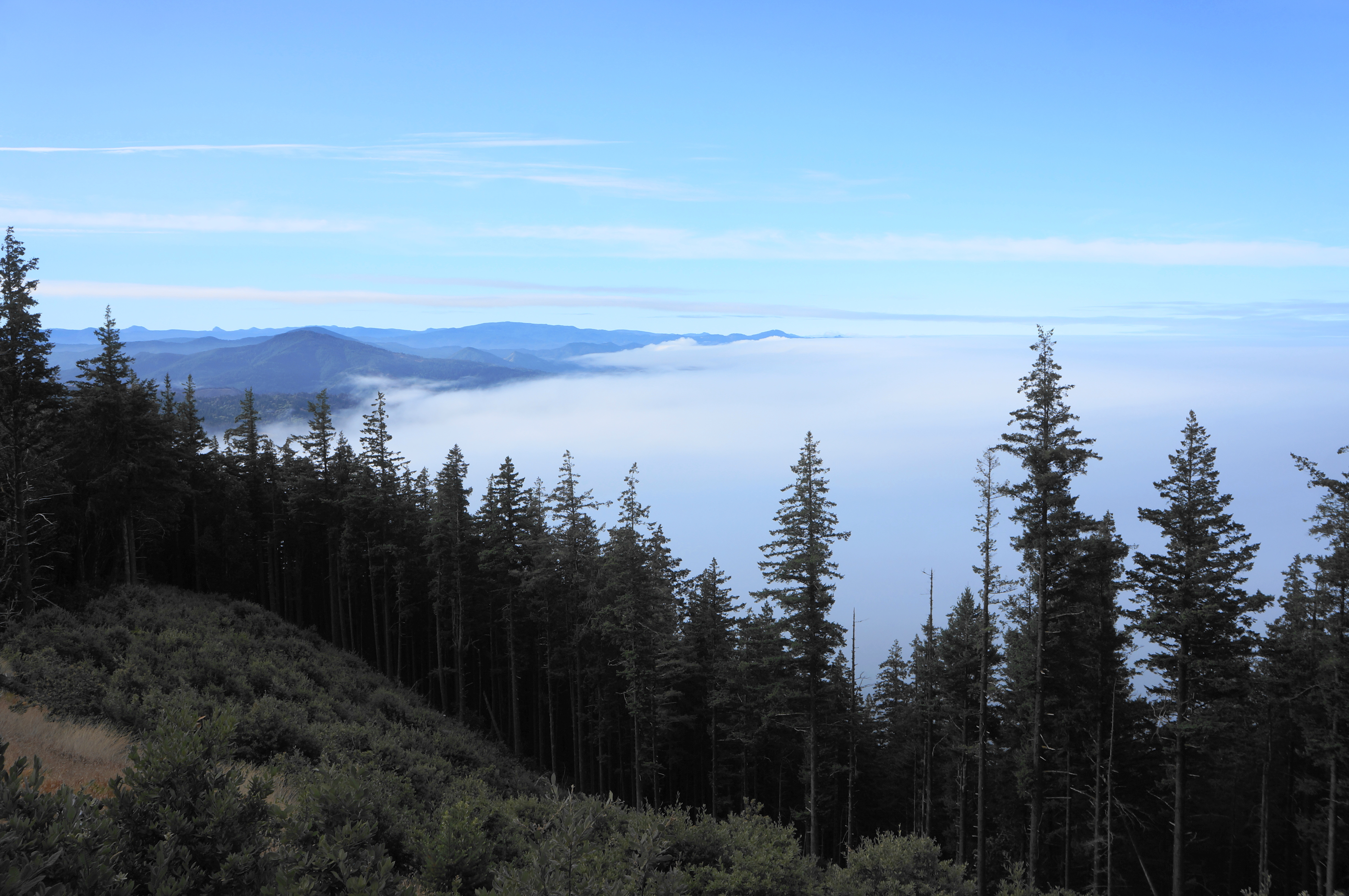 When ready, find your way back to the trail junction, evading the fallen trees and thick brush. At the junction, look for a path heading downhill, away from the Western Route. This is the start of the Eastern Route. While the initial track is a little blurry, it soon comes into form as the trail exits the summit area, coursing around to the east side of the mountain. Round a left-hand bend and continue north, continuing to gradually shed elevation. Settling into a pleasant downhill, bear west and clear a sharp switchback at about 2.5 miles, passing through patches of bay laurel and Sitka spruce. Proceed around a long rightward curl, then clear a left-arcing bend with a bench for resting.