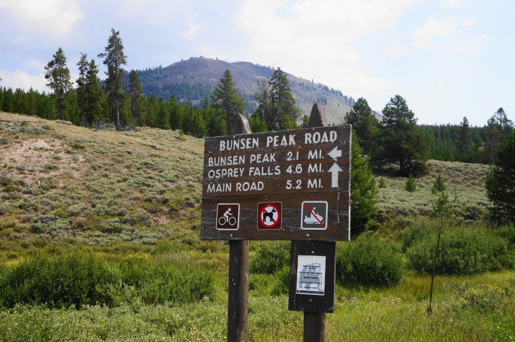 Bunsen Peak (8,564’), thought to be the eroded remains of a volcano that never blew its top, is clearly visible from the parking lot. There are two routes leading eastward from the trailhead, including the summit-mounting Bunsen Peak Trail and the milder Bunsen Peak Road, which will serve as the return route for this 7-mile loop hike.