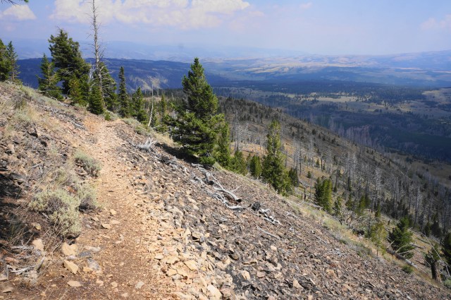 Come to another cliffside vantage at around 4/10 mile, then cut south and east across open sagebrush with unobstructed views southwest across Gardner’s Hole and Swan Lake to the rest of the Gallatin Range—headlined by Antler Peak (10,063’), Bannock Peak (10,323’), and Mount Holmes (10,336’). After a couple winding bends, settle into a long uphill switchback that cuts north through a fire-damaged area.