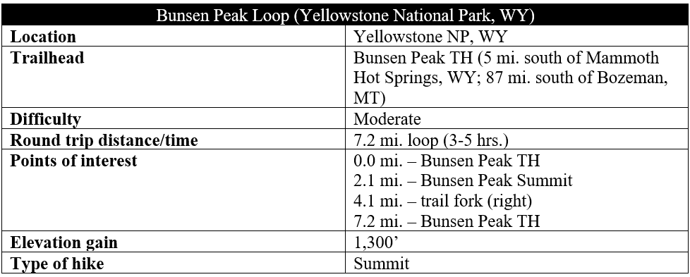 Named for the same German scientist who invented the Bunsen burner, Bunsen Peak (8,564’) is a prominent peak set high above Gardner’s Hole and Mammoth Hot Springs in northwest Yellowstone National Park. Today the summit is a popular day hike destination with panoramic vistas across the vast Wyoming/Montana landscape. Continuing on past the summit, ambitious hikers can turn this hike into a 7.2-mile loop (or a 10-miler if adding the spur to Osprey Falls).