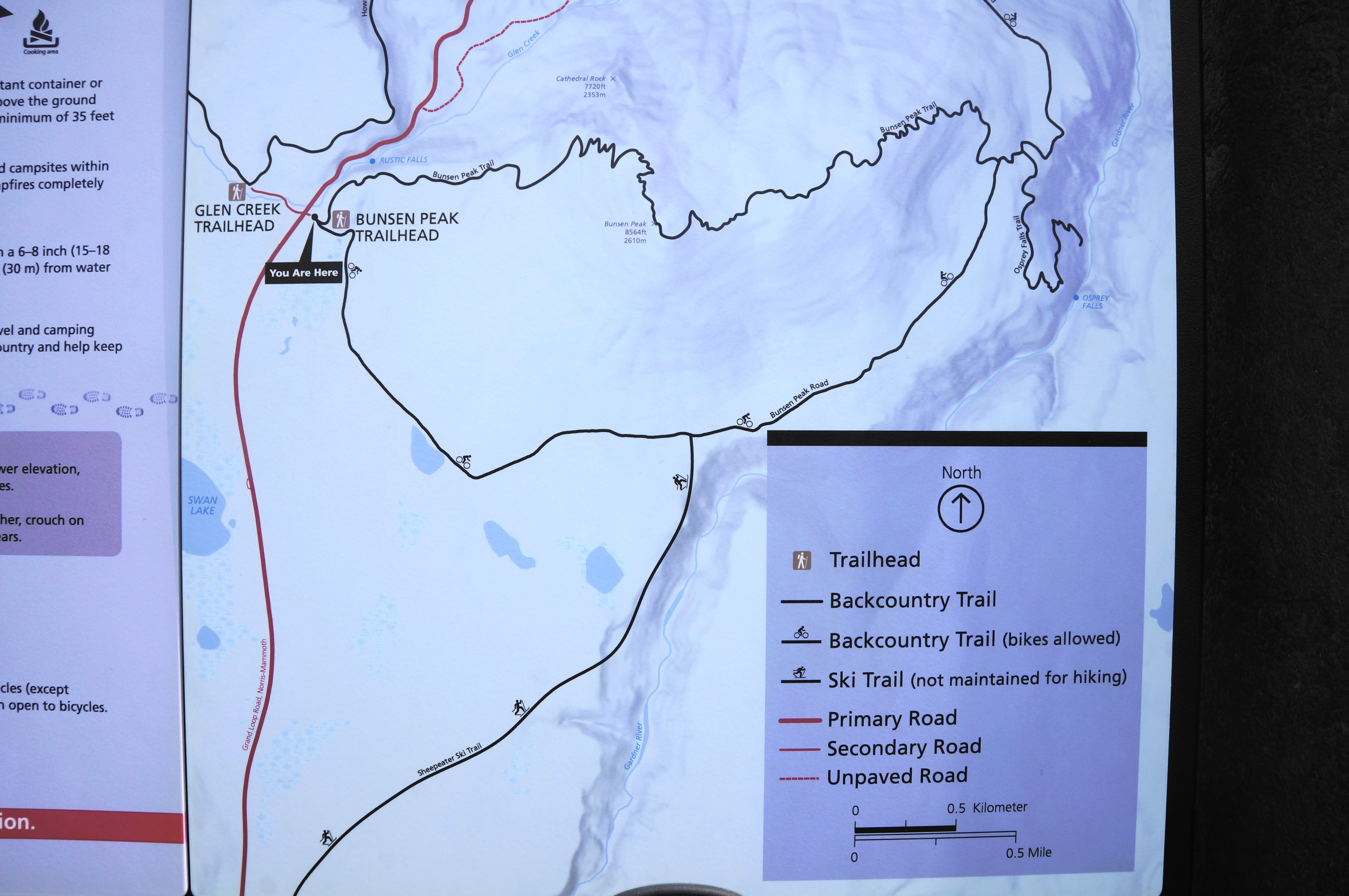 Bunsen Peak (8,564’), thought to be the eroded remains of a volcano that never blew its top, is clearly visible from the parking lot. There are two routes leading eastward from the trailhead, including the summit-mounting Bunsen Peak Trail and the milder Bunsen Peak Road, which will serve as the return route for this 7-mile loop hike.
