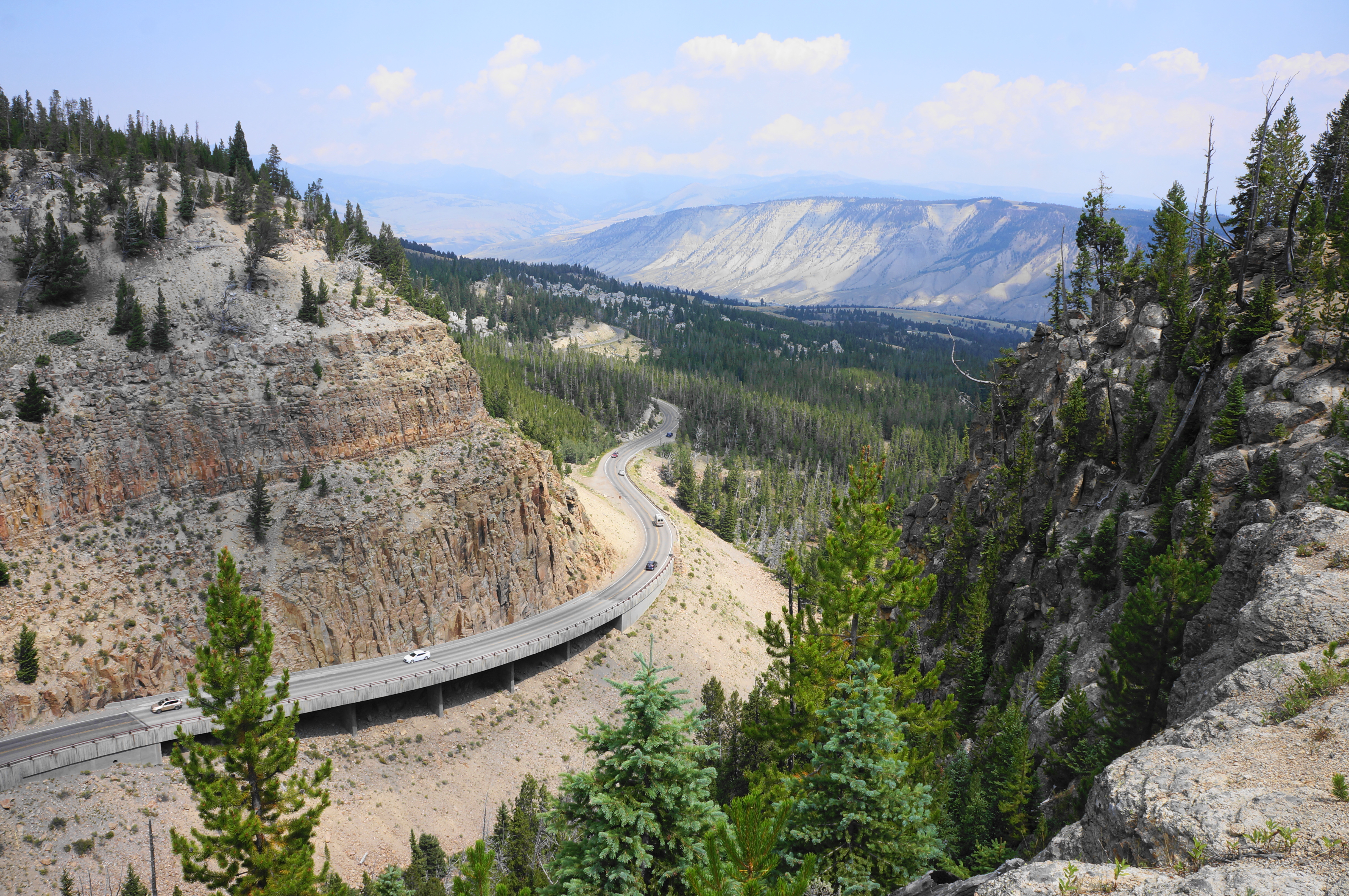 Coming from Montana to the north, US Highway 89 rises out of Gardner Canyon to Mammoth Hot Springs in northwest Yellowstone National Park, then splits into the Grand Loop Road. Continue south as the popular drive ascends from Mammoth to a narrow notch called the Golden Gate, where there is a pull-off with a view across Kingman Pass (7,120’) and roadside Rustic Falls.