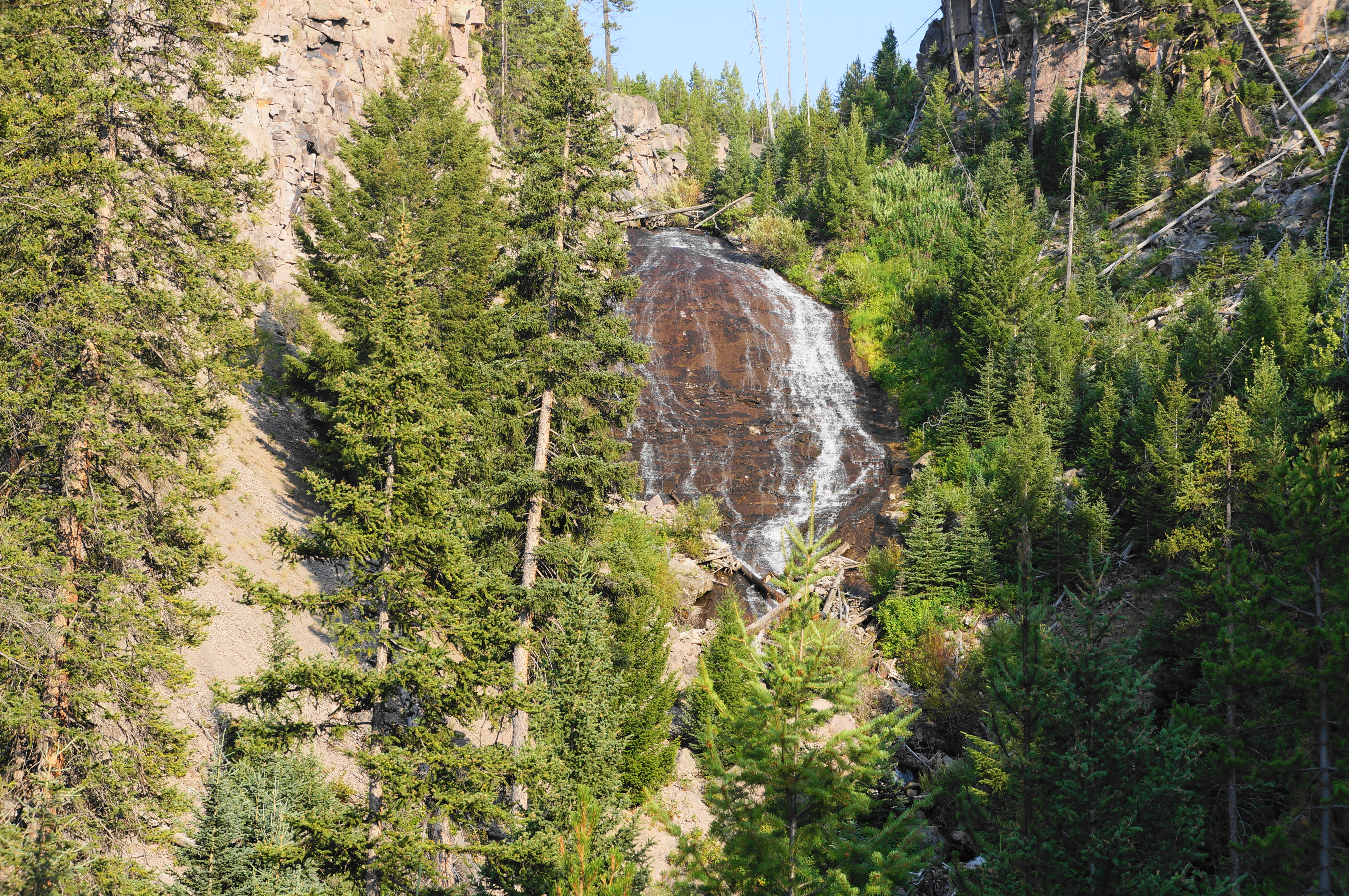 The northwest section of Yellowstone National Park features many of the park’s waterfalls. While perhaps less impressive than roadside Gibbon, Rustic, or Undine Falls, viewing the curiously-named Wraith Falls at least requires visitors to get out an stretch their legs on a short, 0.45-mile trail that culminates at a viewing platform opposite the 79-foot cascade. The hike traverses sagebrush slopes, stands of mixed conifers, and marshes.