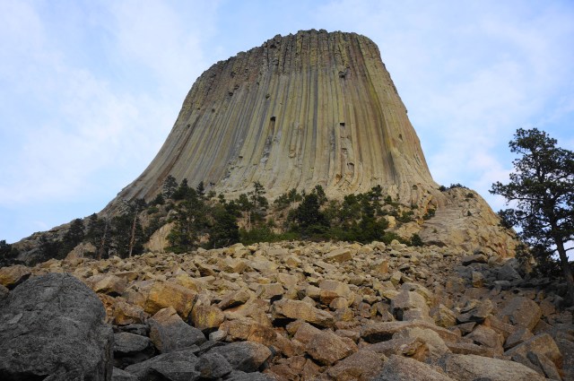 Head left to follow the Tower Trail in a clockwise direction. The tread turns from concrete to asphalt and is no longer technically wheelchair-accessible (although potentially possible to maneuver). After heading north for about 1/10 mile, come to a spur that veers right, dipping into a boulder field at the base of Devils Tower. This is the best view so far of the igneous intrusion, the origins of which are still debated.