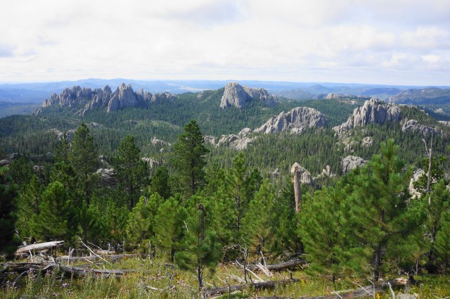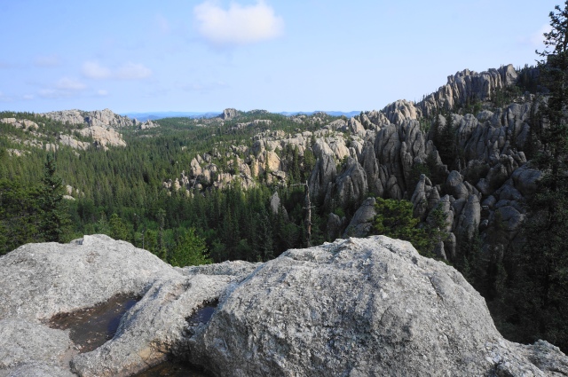 View southwest to Cathedral Spires, Little Devils Tower, and Custer State Park