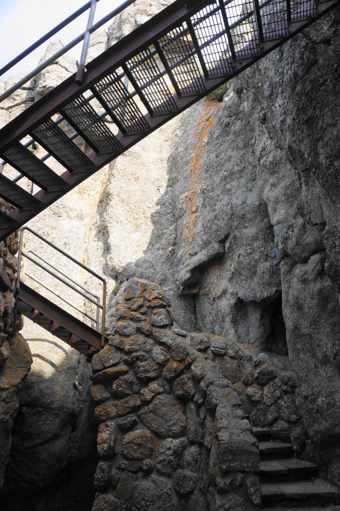 Ascend steps and bends to another junction at 3.1 miles. With the observation tower atop Black Elk Peak now in view, bear left (foot traffic only) and round to the west side of the mountaintop before coming to the iconic final stretch: a lengthy staircase, followed by an ascent through a narrow notch. A short tunnel leads to a metal staircase that bridges a crevasse. Back in the sun, a spiraling staircase threads the granite spine and ends at the Black Elk Peak Fire Tower, constructed by the Civilian Conservation Corps in the 1930s. This is the highest point in South Dakota—and the highest between the Rockies and the European Pyrenees!