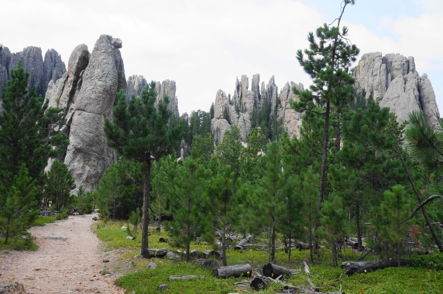 Coursing a relatively level ridgetop, the very mild meander snakes closer to Cathedral Spires and Little Devils Tower. A slight uphill offers partial views back toward Black Elk Peak, then a descent runs straight toward the epic spires. Stay right at the next junction, leaving the Norbeck Trail in favor of Trail #4 (a.k.a. Little Devils Tower Trail). Ascend briefly, then descend again, passing a monolith on the left. The trail leads right, but a short spur left offers good views of the backside of Cathedral Spires.