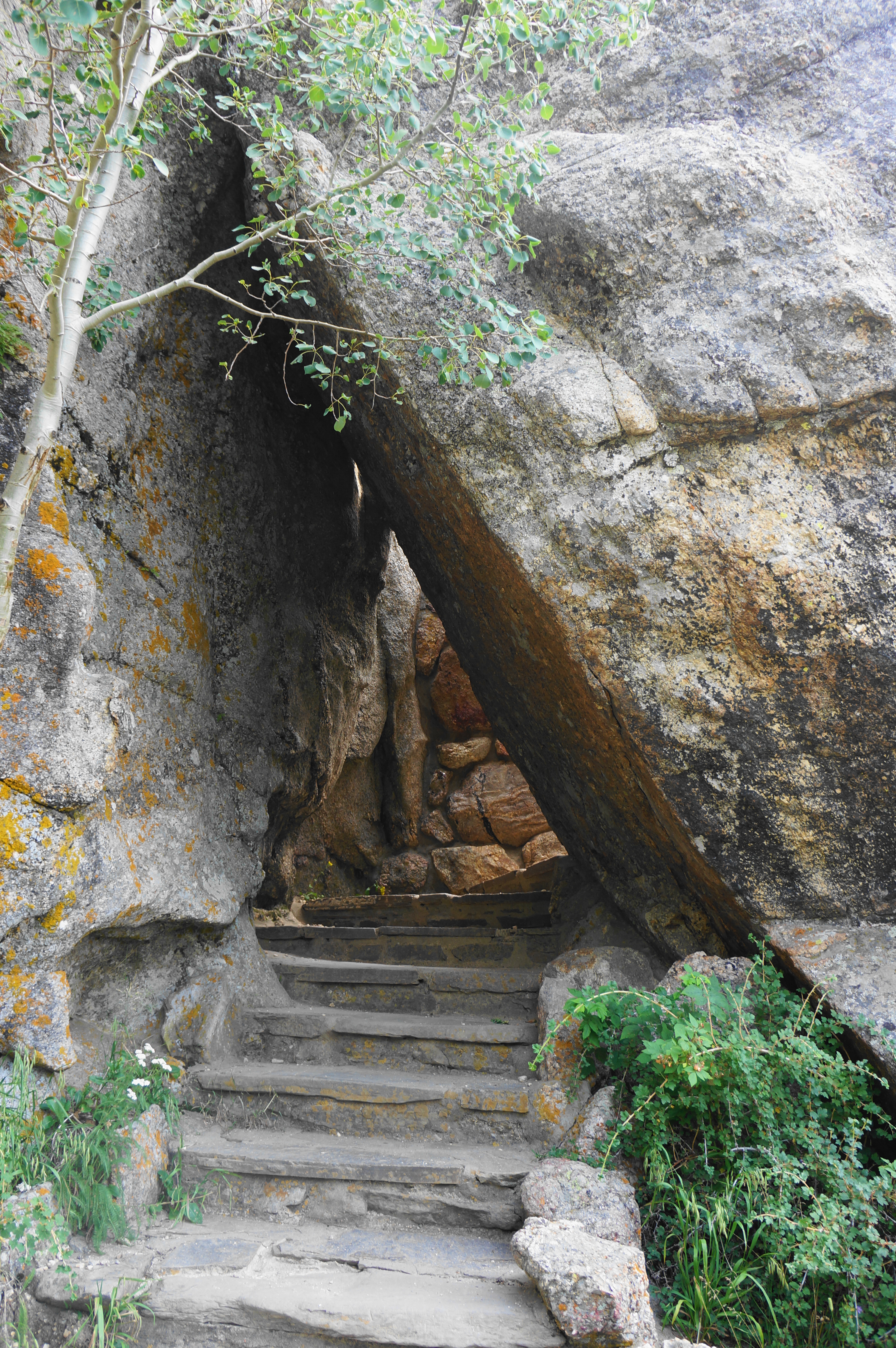 A few minutes later, cross a small footbridge over a mild stream and stay right at the junction with the Lost Cabin Spur (Trail #2B). A mild uphill returns as the trail gradually climbs out of the woody drainage basin; two large boulders on the left signal the start of a steeper incline with some wooden and stone steps. Pass twin pinnacles on the left again and make a more rigorous ascent to another saddle, set below the peak.