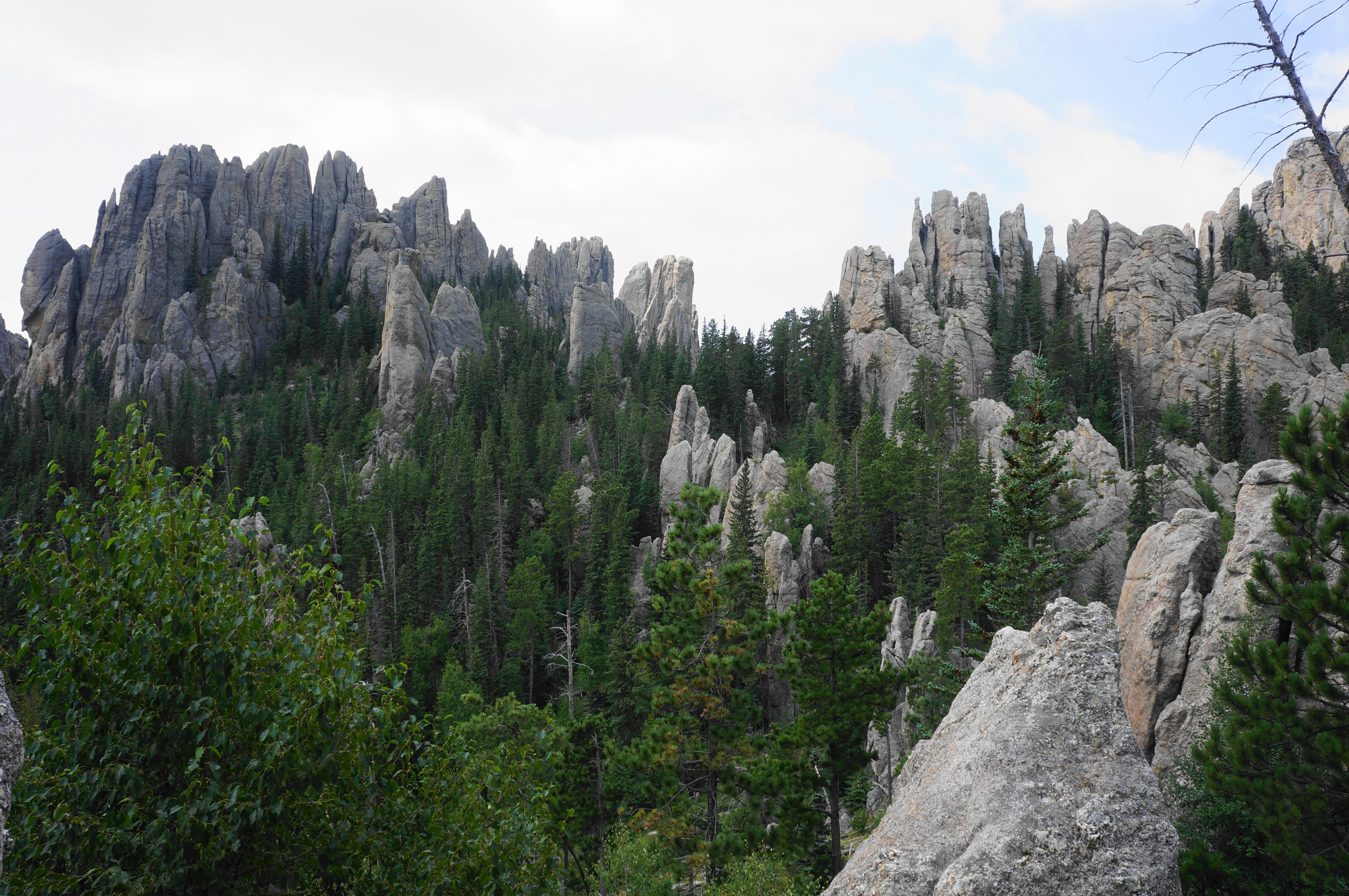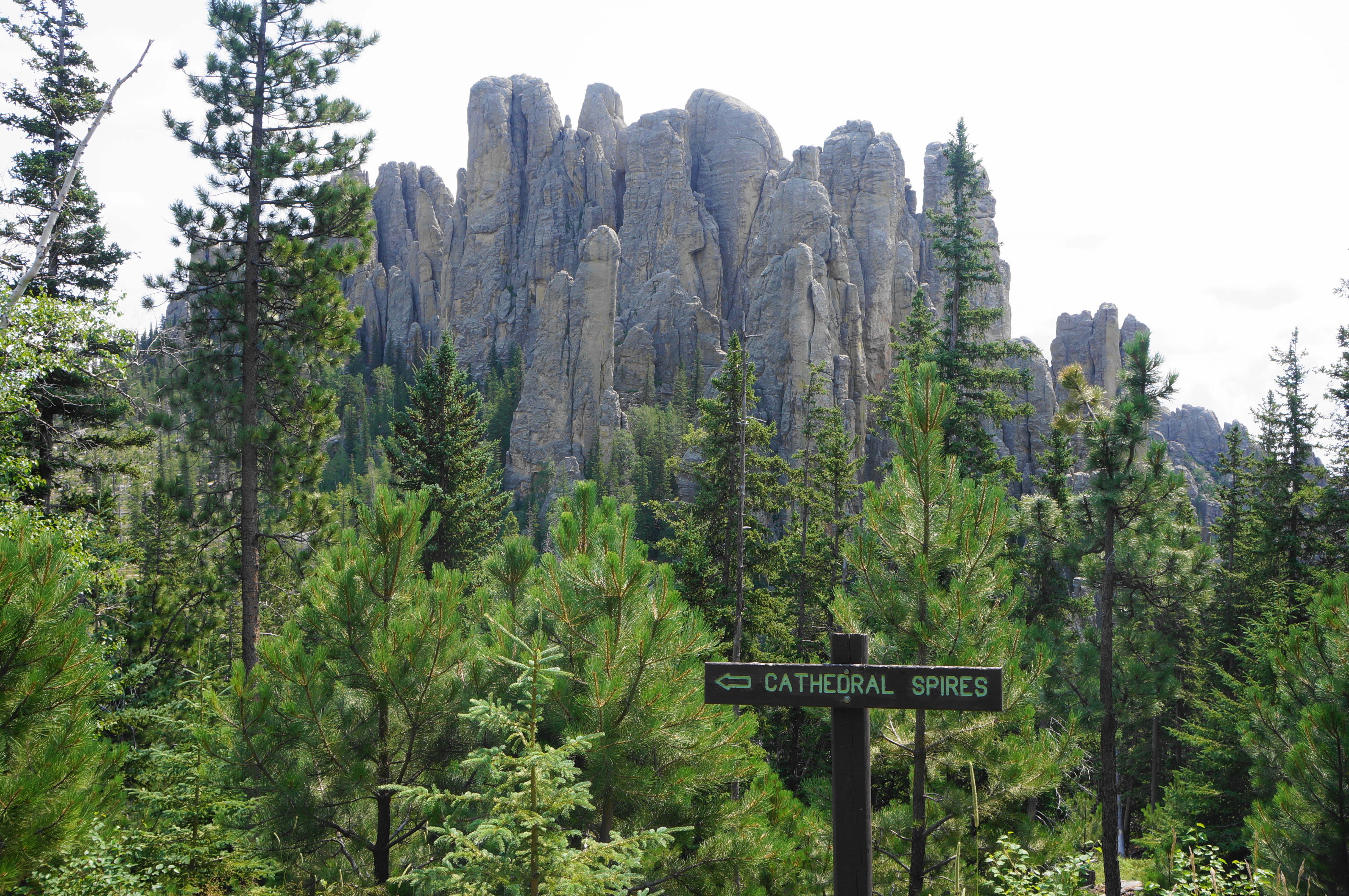 View southwest to Cathedral Spires, Little Devils Tower, and Custer State Park