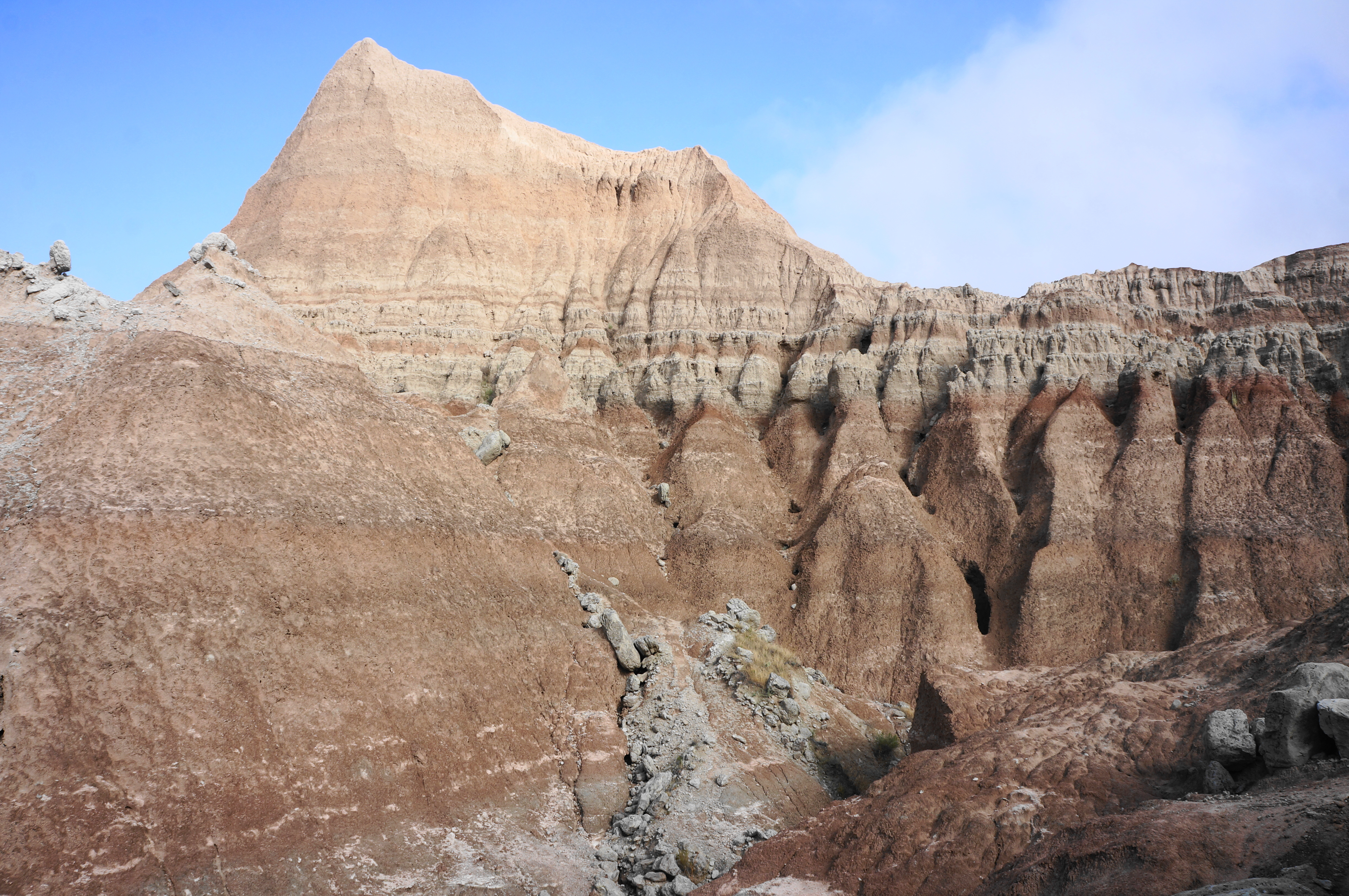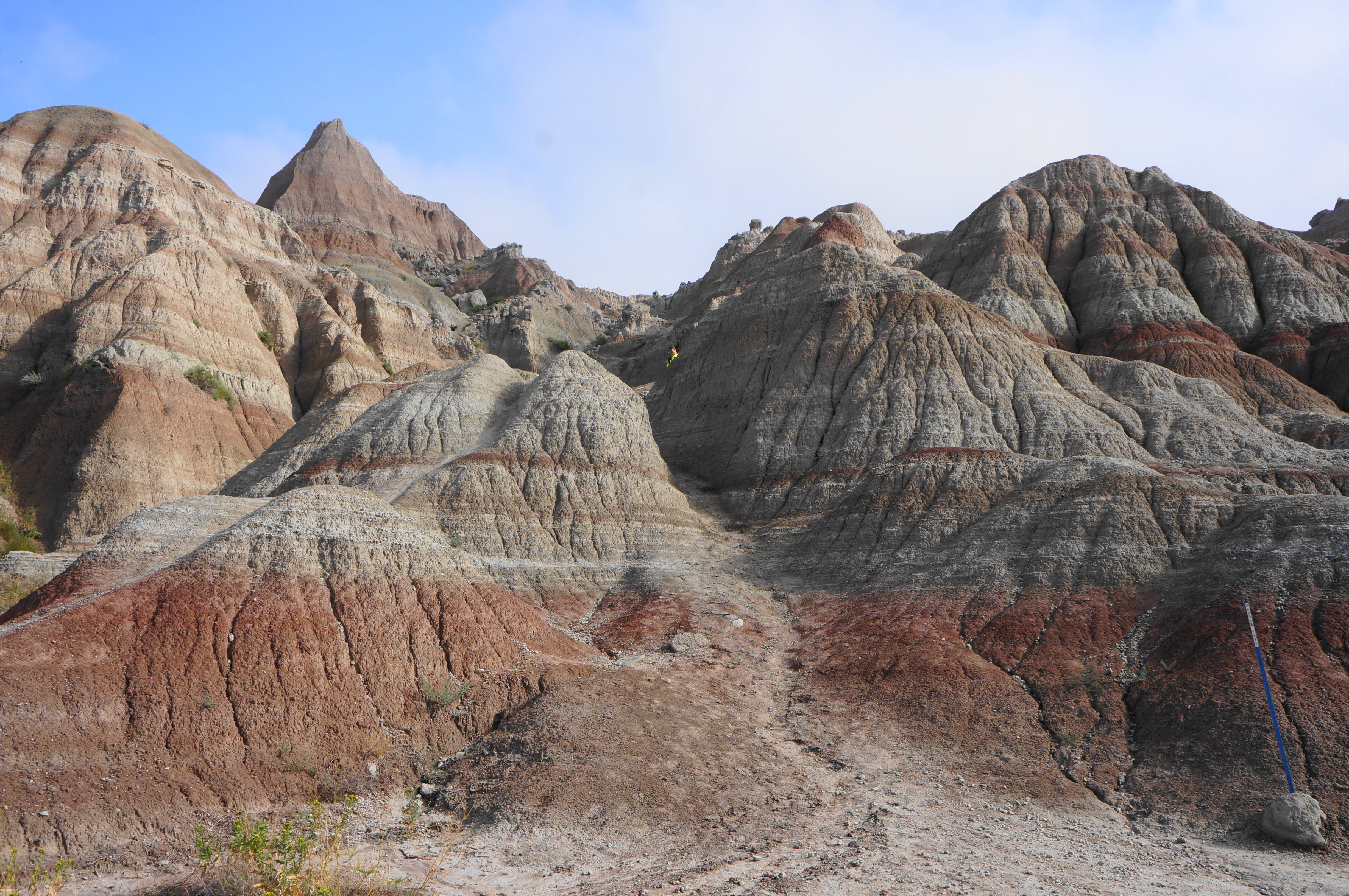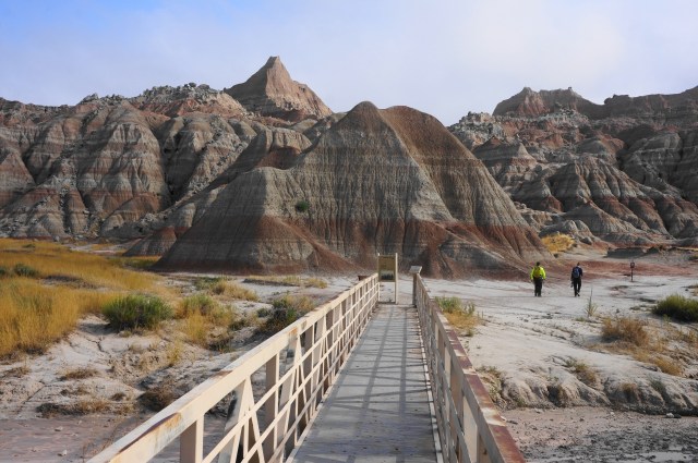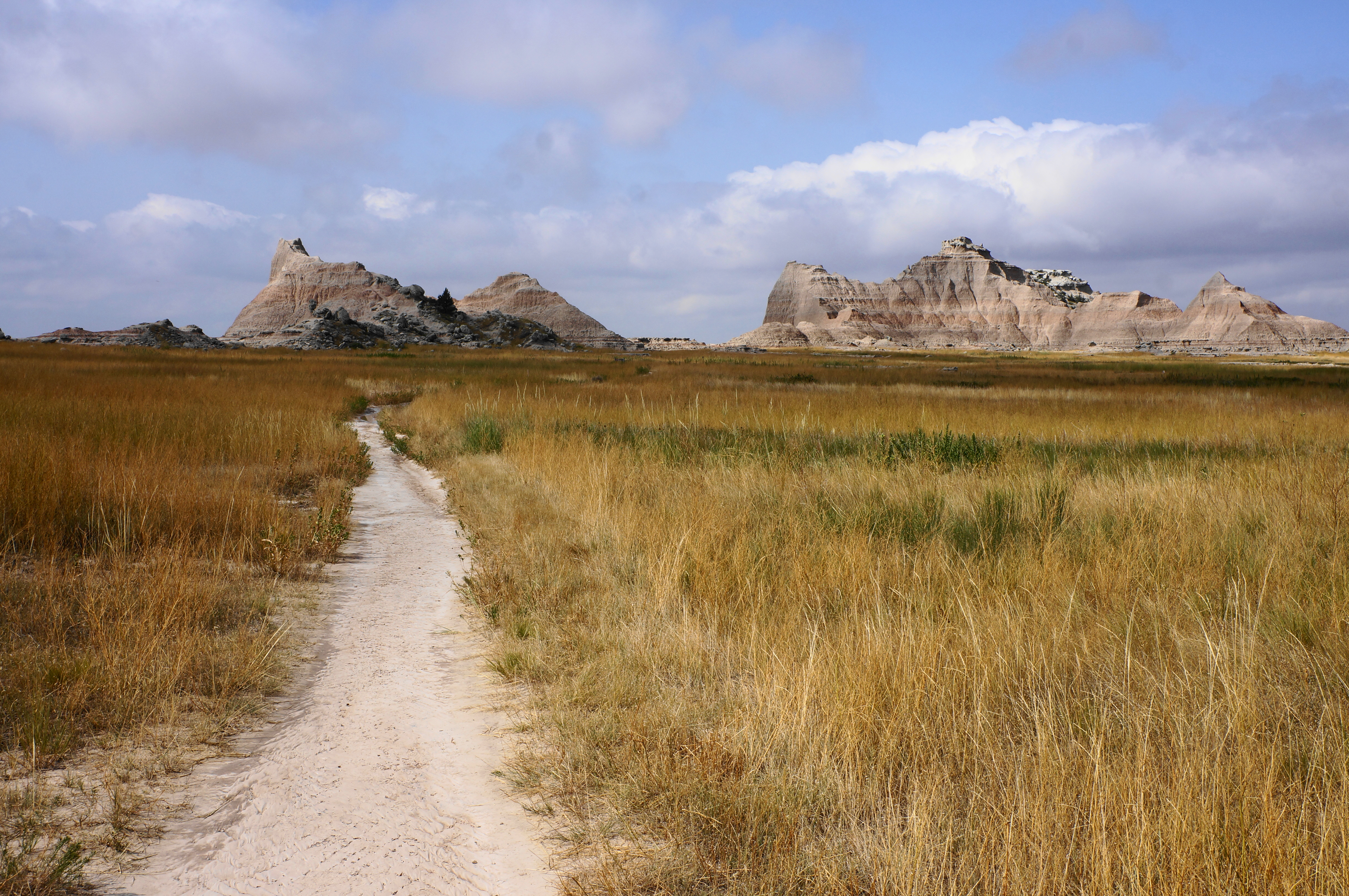 Roughly two miles west of the Ben Reifel Visitor Center and Cedar Pass Campground in Badlands National Park, the Saddle Pass Trailhead has room for around a dozen vehicles. Here the sunburned prairie runs up against the roughly 200-foot Badlands Wall—a seemingly impenetrable block of eroded spires, buttes, and pinnacles towering above the plains landscape. But sure enough, after crossing a bridge over a highly-intermittent stream, a clay path rounds a multihued butte and reveals a winding path up the “wall,” notch by notch.