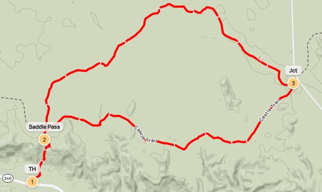 Bear left and retrace your steps on the Saddle Pass Trail, taking care as going down a steep slope is more difficult than ascending. Soon you’ll be back at the base of the cliffs and the parking lot, having completed the 4.6-mile traverse. Expect to take about 2-3 hours for the moderately difficult hike.