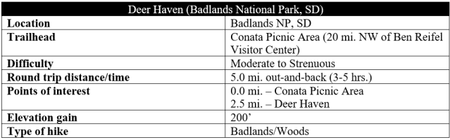 Many choose to spend the night at Deer Haven, making this a multi-day hike. But it’s possible to do within 3-5 hours or so, leaving time for additional exploration around Badlands thereafter.