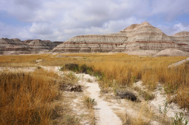 Start at the Conata Picnic Area (see map) off Conata Basin Road, a partly-paved track connecting the Badlands Loop Road with State Route 44. The sun-soaked picnic area is set at the base of the striped badland formations, with neat streaks of ruby hues cutting up the dreary cream colors. Begin at the trail sign and backcountry register and follow the sandy path leading westward across an open plain. Trace the trail up and over a small hump to reach a second drainage basin. Ignore the social trail heading right; stay left as the route courses south, staying down on the flats and avoiding the temptation to head straight into the alluring but dizzying sandstone formations.