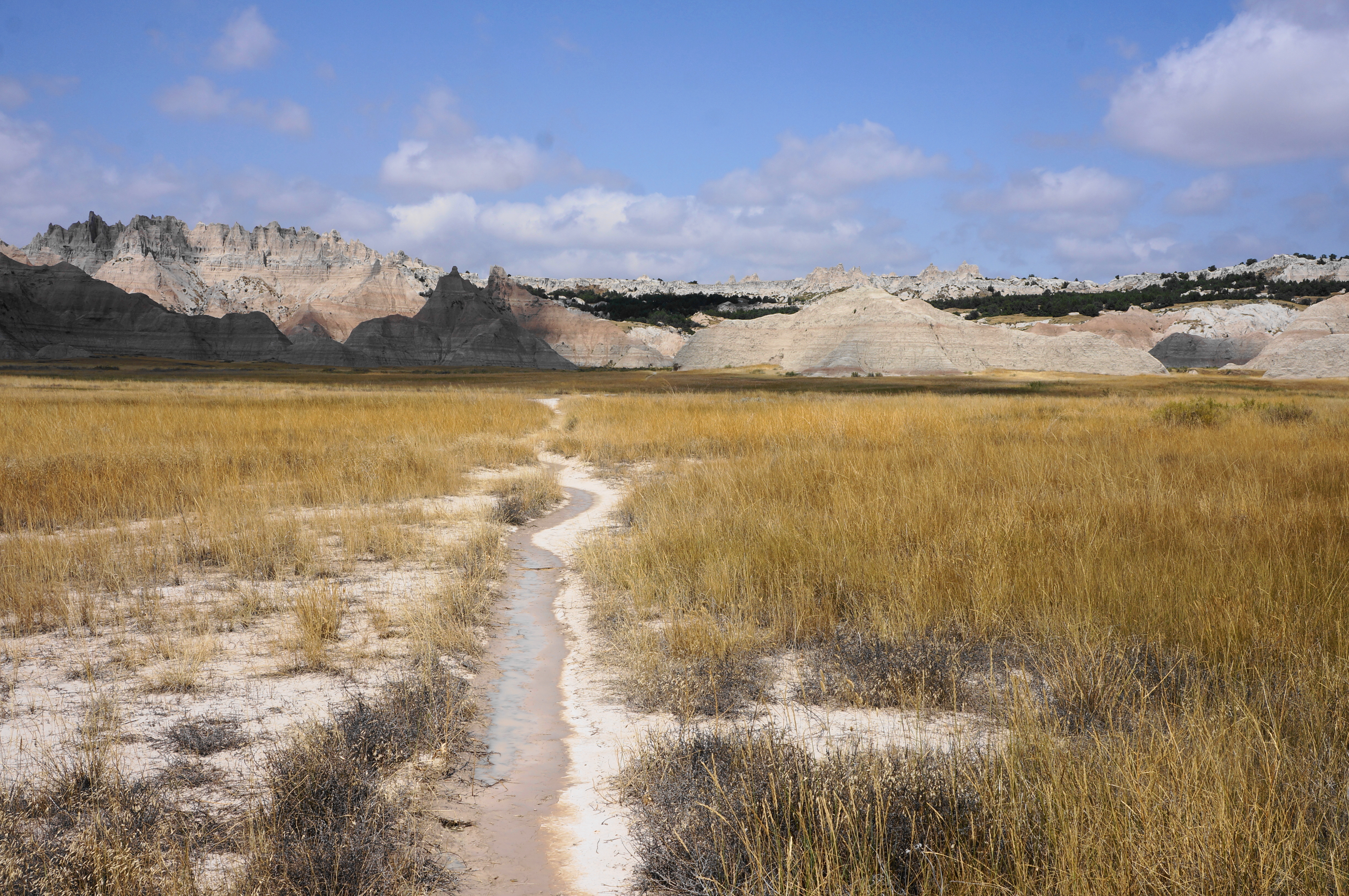 Soon connect with another social path coming in from the left (this is an alternative route back to the trailhead) and rise mildly to another large, grassy plain. Pass reeds and a small clump of verdant trees on the left, then traverse a mucky drainage that skirts a badland snugly on the right. Cross more grasslands and rise to a small gap between some modest formations.