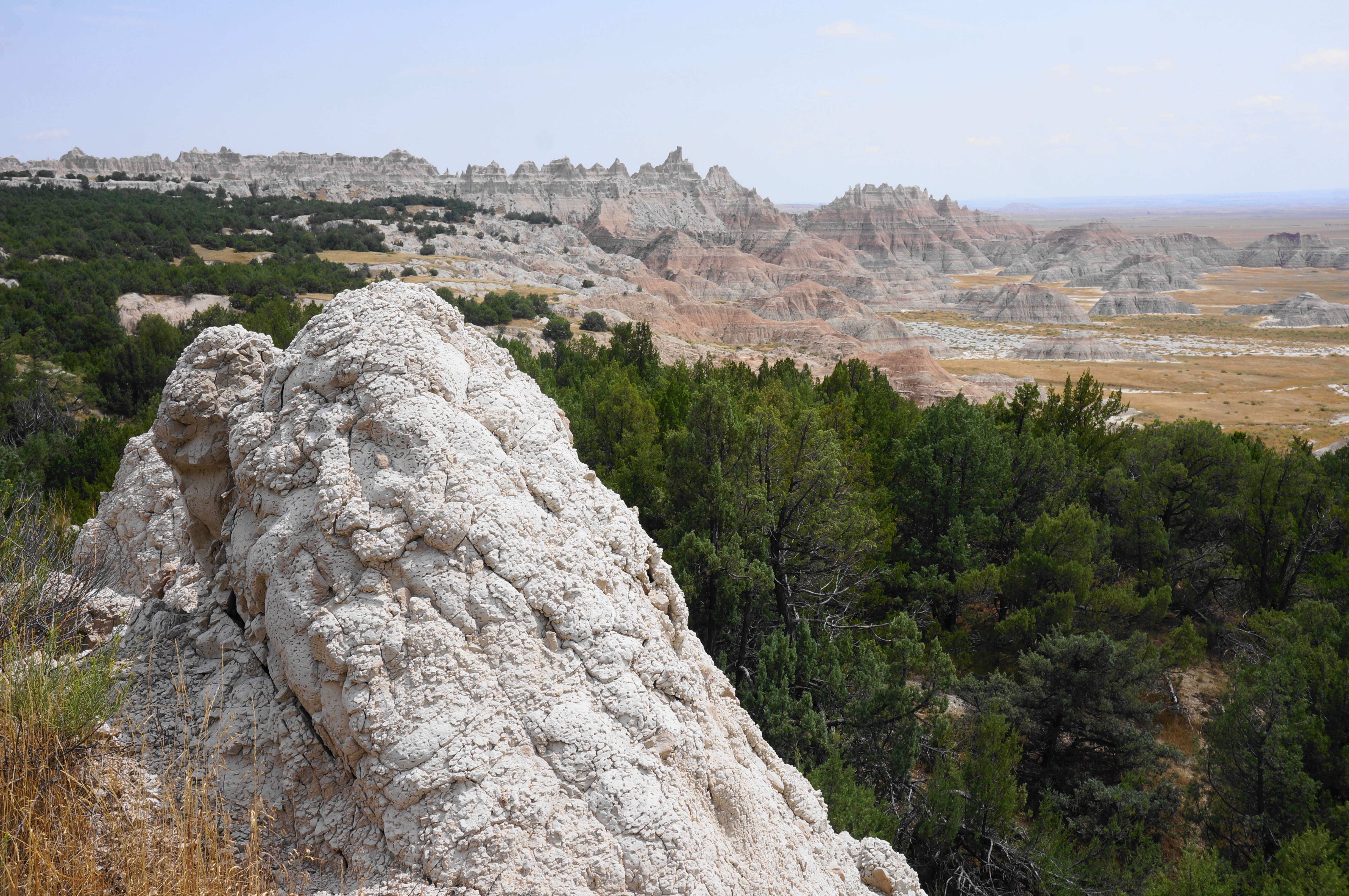 The even-more-ambitious among you can proceed further, finding one or two of the notches that offer passage—perhaps a Class 2 scramble over scree and up a shelf—through the wall and on to the hightops. Once clear of the climb, the tread is surprisingly easy: a flat and pleasant plateau with vistas both south and north. The latter views extend all the way to the Pinnacles area and across Sage Creek Basin to the main badlands below Big Badlands Road.