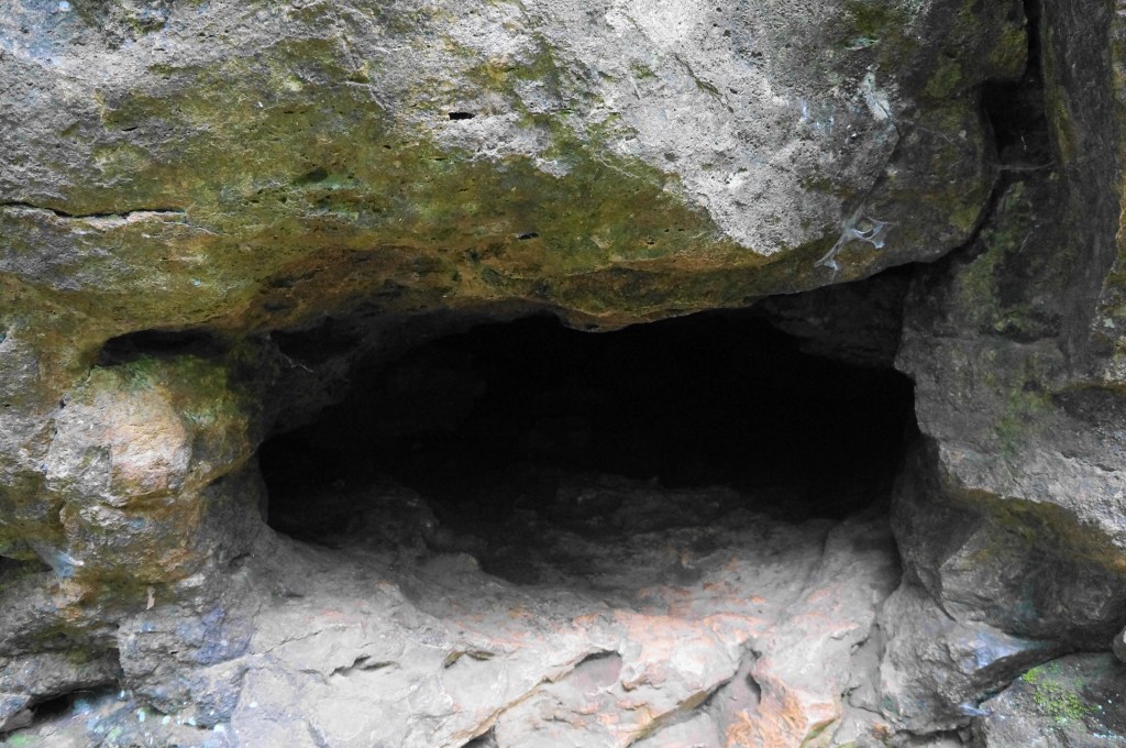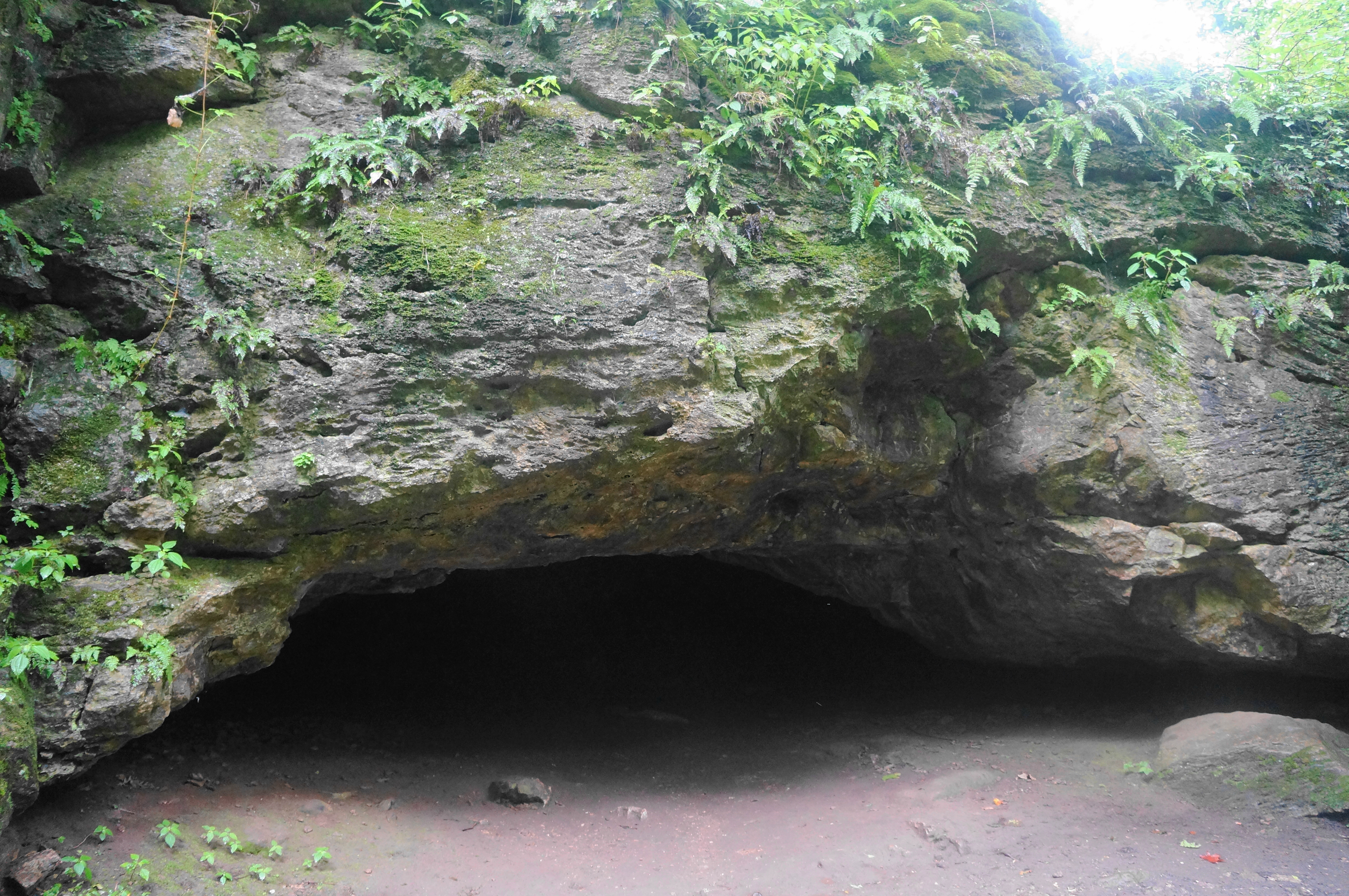 Return to the saddle and drop down to the right to the creek basin again. Bear right, now heading back in the direction of Dancehall Cave and the parking lot. After crossing over Raccoon Creek, take the next two left turns, climbing again on a wooden staircase to Shinbone Cave, a small crawlspace that goes back an estimated 75 feet. (Note: The entrance is actually sort of hidden at first glance; come to the alcove and look right, next to the wooden path up past the cave; this tunnel is the entry.)