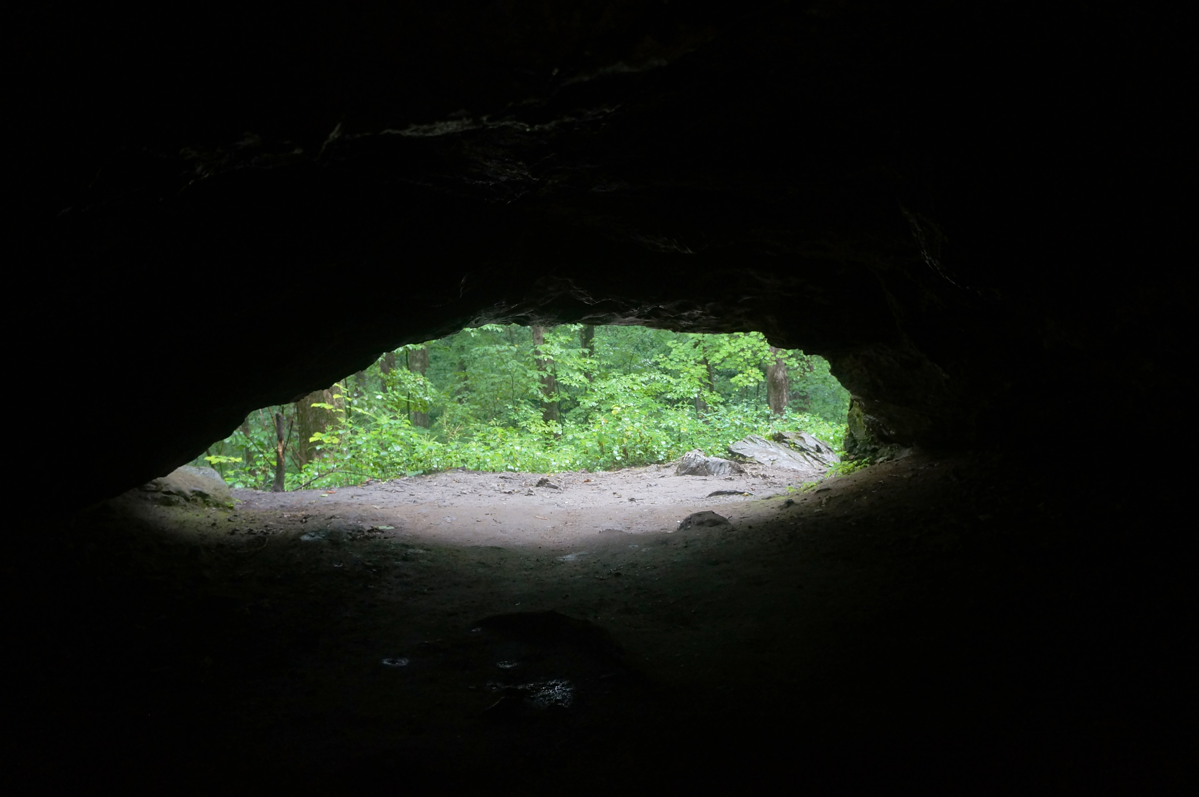 From Shinbone Cave, the onward passage gets a little confusing. One option is simply to drop back to creek level and follow the Dancehall South Trail back to the parking area. But others determined to stay up on the hightops and visit one more cave can stay left at the cave entrance, then left again at the next two junctions as the thin track rises up to the rim of the cliffs. Thereafter the path rises steeply to reach a higher plateau. Soon you’ll find the Forest Ridge Trail, which bears roughly north-south. Take a right and come soon to a drainage and short spur down to Wye Cave, actually a network of cave passages but with a big barrier to entry: a 6-foot drop that is difficult to navigate. (Note: As of summer 2024, there was a log wedged in the cave to assist with climbing in and out.)