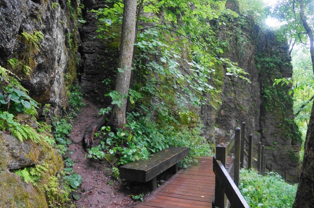 The recommended route covers terrain on both the north and south sides of the road and actually forms a figure-eight (part of the route is underground, passing right under the road!). Begin with the northern section first, finding the Ridge Trail (aka Woodland Trail), which skirts east of a small amphitheater. It begins as a paved track, but after some steps down, curves right and turns to dirt. Head north as the route passes through deciduous forest, staying right at an unmarked junction after about 250 yards. Cross a short bridge to clear a minor tributary and enter an uphill section, then a brief decline, followed by a steeper rise. At about 4/10 mile, the trail rounds a left-hand corner and drops downhill and hugs a wall of dolomite.