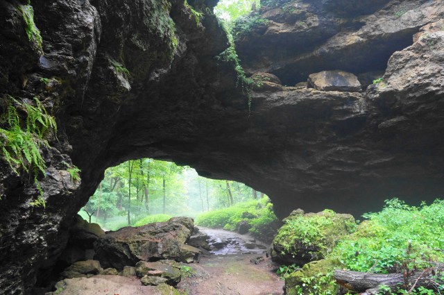 After Up-N-Down, take the next two lefts, following Raccoon Creek as it passes under the Natural Bridge, a photogenic formation and arguably the highlight of Maquoketa Caves. The trail passes right under the bridge en route to the grand upper entrance of Dancehall Cave.