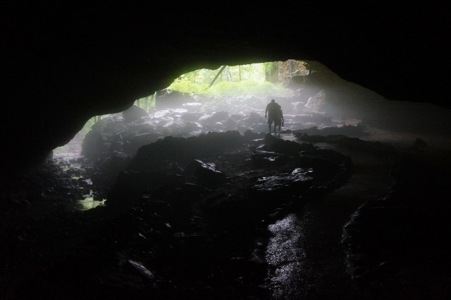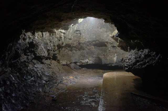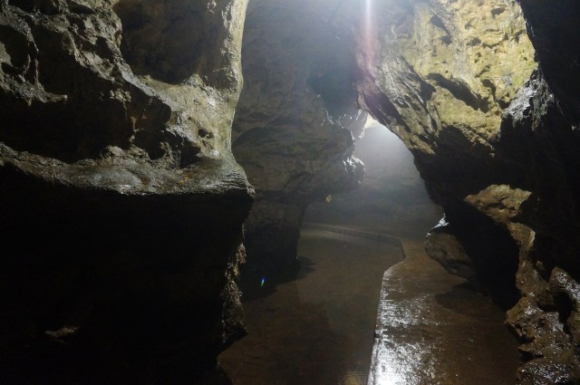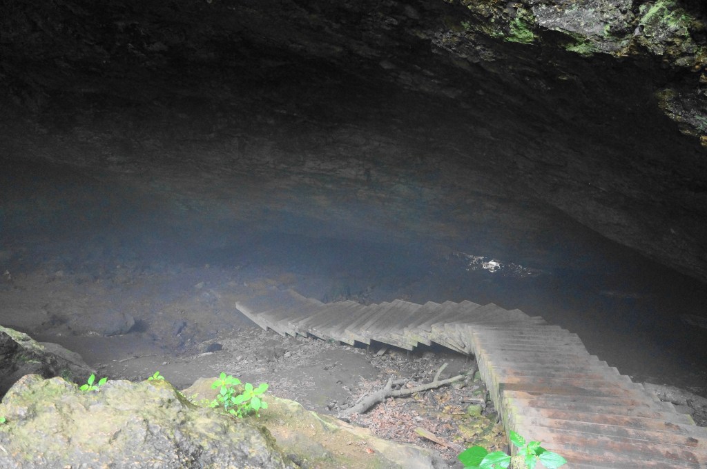 There is an opening partway, known as the Middle Dancehall Cave Entrance, with a wooden staircase leading up and out of the cave area. Pass this on the right and continue through the lower cave. This portion is shorter and ends with a more modest entrance and a junction.