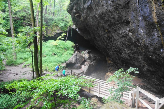 Dancehall Cave (1,100 feet long) is by far the park’s largest and begins with a descent of several dozen stairs, plunging hikers into the dark, damp passage. The asphalted path guides travelers through the water-logged tube and follows artificial light to ease the journey. Round a right-hand corner, after which the cave narrows and follows the still creek through the dolomite cavern. (Note: Hikers are passing under the road and parking area to the south side.)