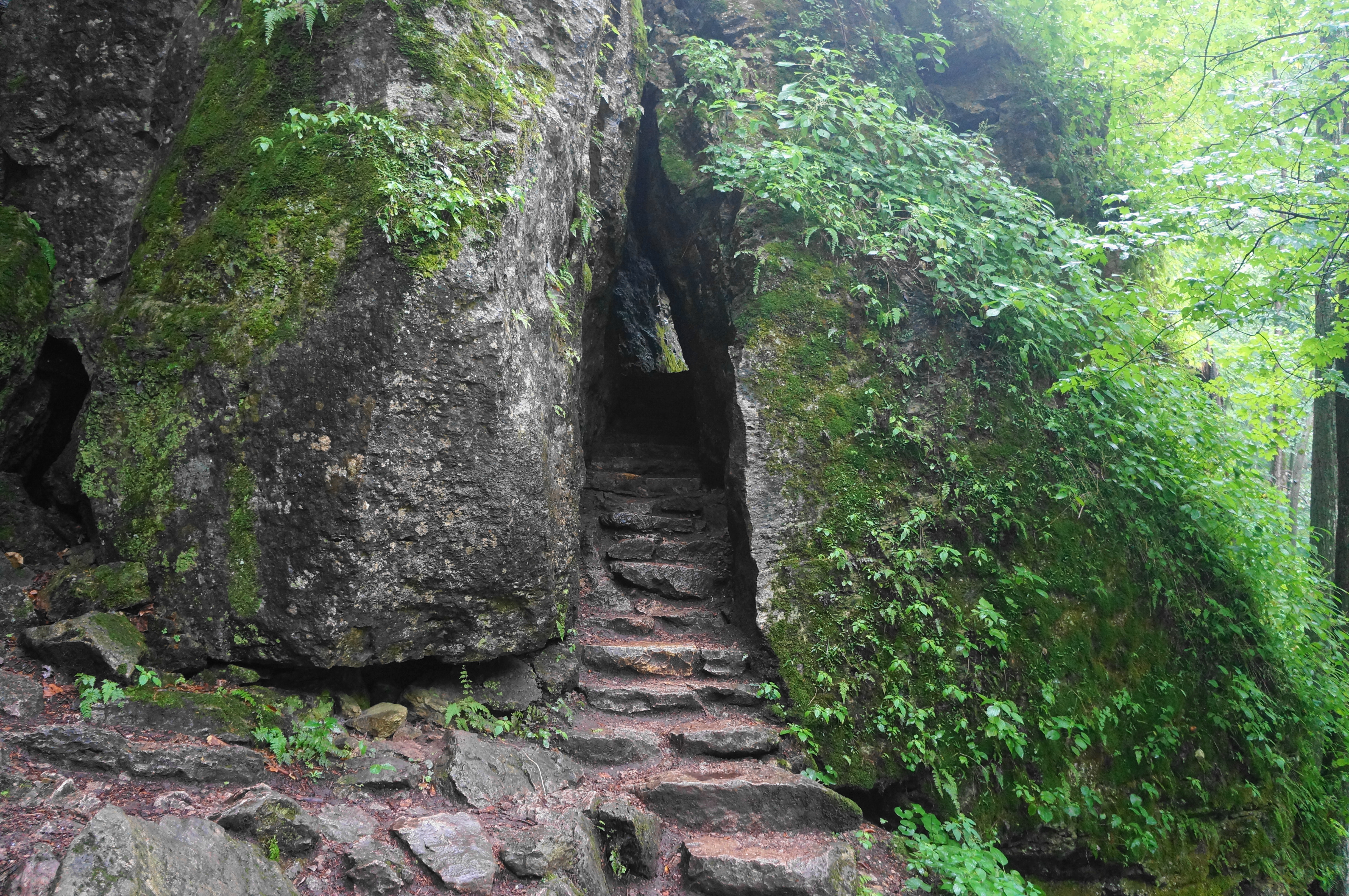 After Rainy Day, the trail reverts to dirt again, then ascends stone steps through a narrow cleft in the rock. Stay left at the next junction, continuing to follow the cliff walls. The path thereafter is more rigorous, requiring negotiating stony up-and-downs. Ice Cave is the next attraction and is more or less one large room and a small one with no water.