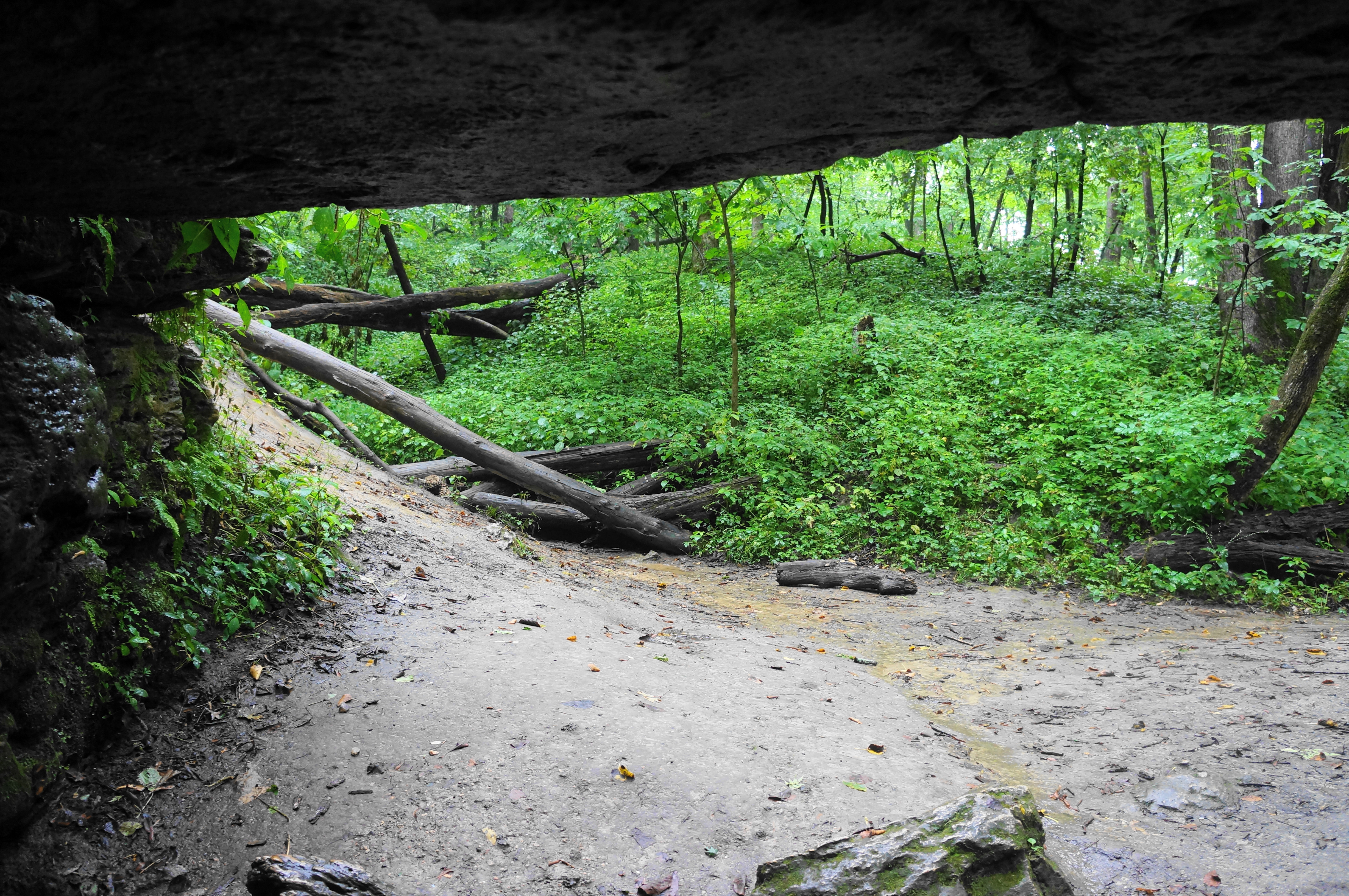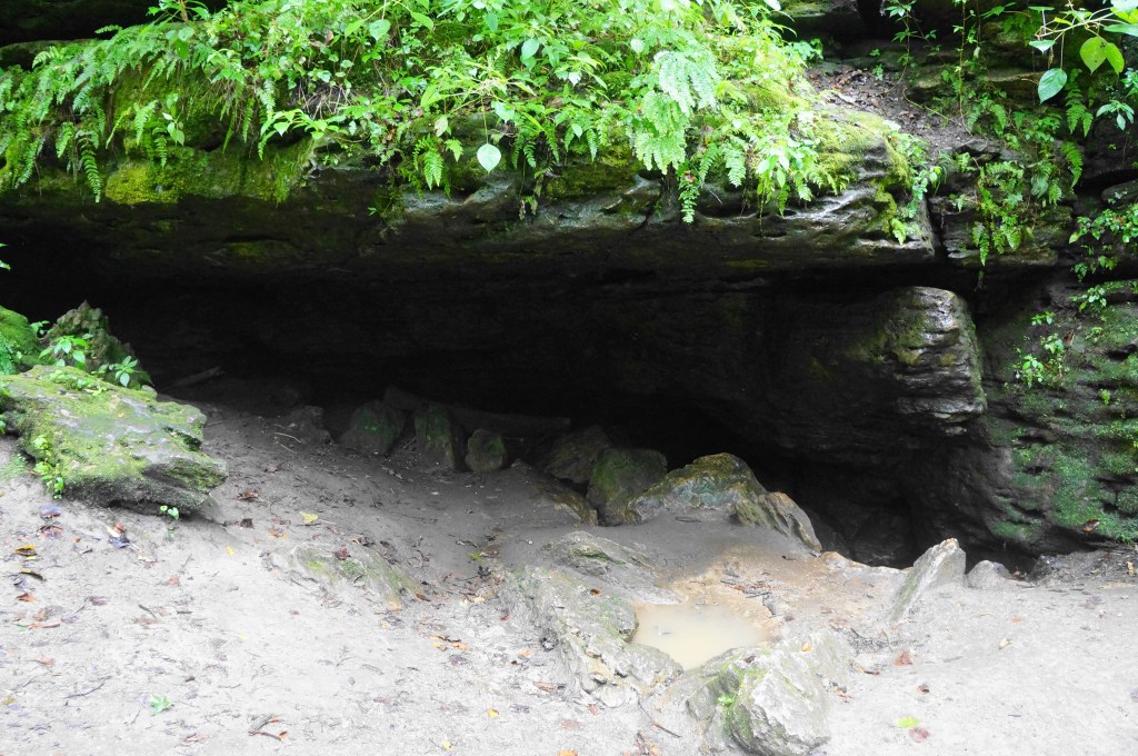 When ready, exit the cave and descend the staircase to return to the Ridge Trail, bearing left as the track curls around protruding blocks of dolomite and reaches the Raccoon Creek floodplain on the right. Treading south, the trail comes soon to the second cavern, known as Dug Out Cave, which is more or less a brief alcove with little depth.