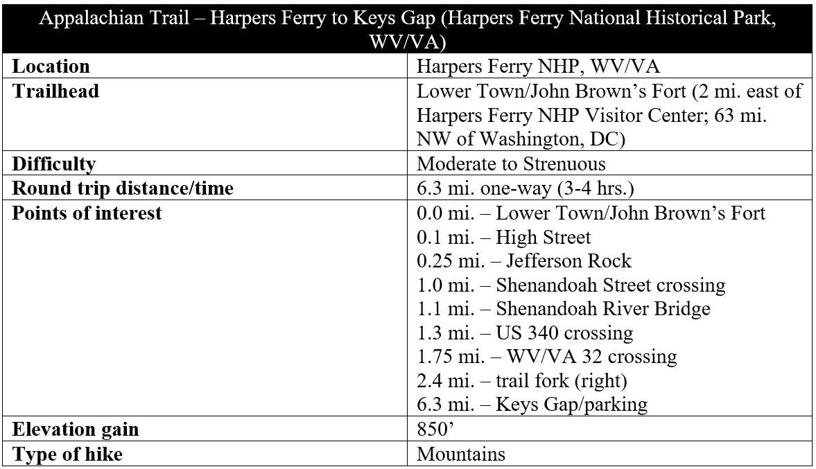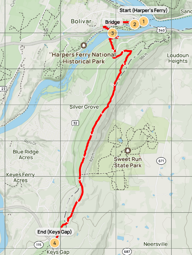 Having returned to the Washington, DC area last fall, my opportunities to get out hiking have unfortunately declined. But I have been able to resume my quest to achieve a long-term goal of completing all the nearby Appalachian Trail (AT) sections (see MD Sections 1, 2, and 3). A lovely day in October 2024 brought me to the Harpers Ferry area, where I hauled up past Loudoun Heights on the Virginia/West Virginia border to Keys Gap, completing VA Section 1 of the AT.