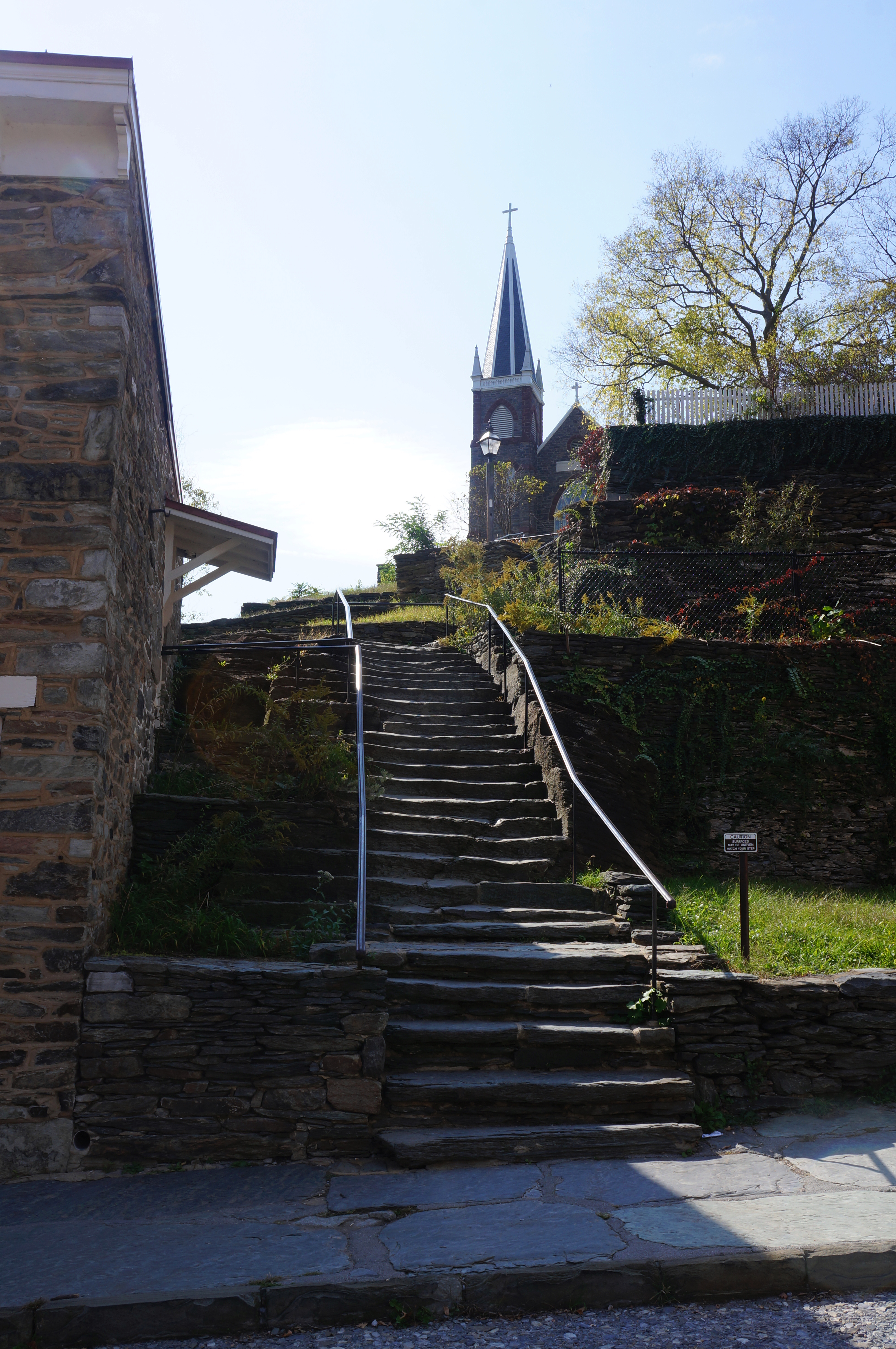 The path soon emerges onto High Street, the main north-south drag through Lower Town. Some of the favorite hangouts for AT through-hikers—celebrating their arrival at the trail’s unofficial halfway point—are situated up the street to the right. The AT continues straight, proceeding up another set of stony steps, climbing to Church Street and the namesake St. Peter’s Roman Catholic Church, constructed in 1833 and remodeled and upgraded in 1896. Stay straight on the road as it passes the small chapel on the left, then find a third set of stairs, this one passing the crumbled ruins of a separate church—St. John’s—over to the right.