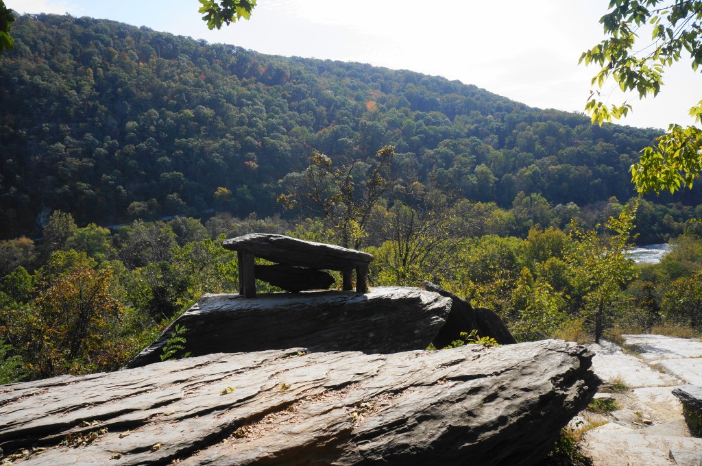 It takes several minutes to traverse the lengthy bridge, enjoying views across the Shenandoah River along the way. Eventually the AT drops down a flight of stairs and passes under the freeway. This marks the start of a relentless uphill, initiated by a stone staircase. From here the trail rounds westward, paralleling the road for a brief period, then the Shenandoah. Round a left-hand bend and ascend another stone staircase, after which the trail grows more rugged, rocky, and wild. The AT soon skirts a drainage before beginning to switchback up the woody hillside. Look for chestnut oaks, black gum, maples, and dogwoods.