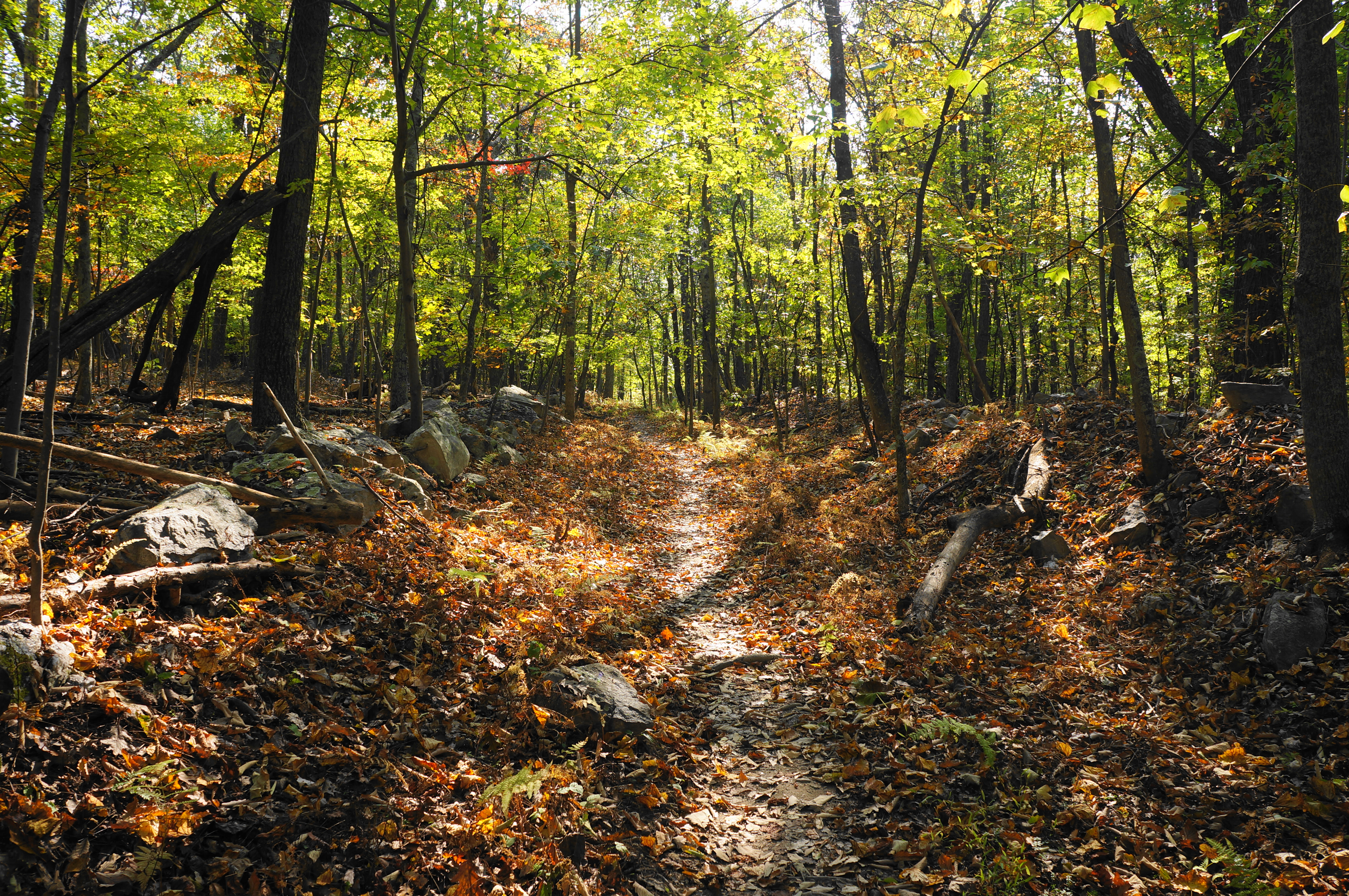 While the hike to this point involved considerable ups and down, the remaining four miles are much milder. As you crest the ridgetop, leave the boundaries of Harpers Ferry NHP and pass the very top of Loudoun Heights (1,175’) over on your right. From here the rocky trail shifts subtly from a gentle uphill to a downhill stroll between two summits. Eventually the incline reverses again, and hikers clear a new ridgeline.