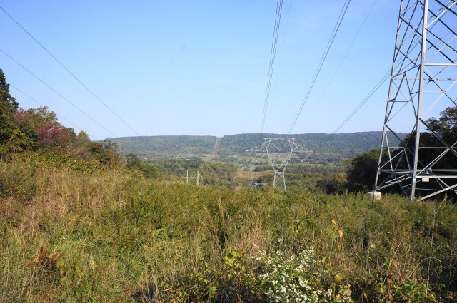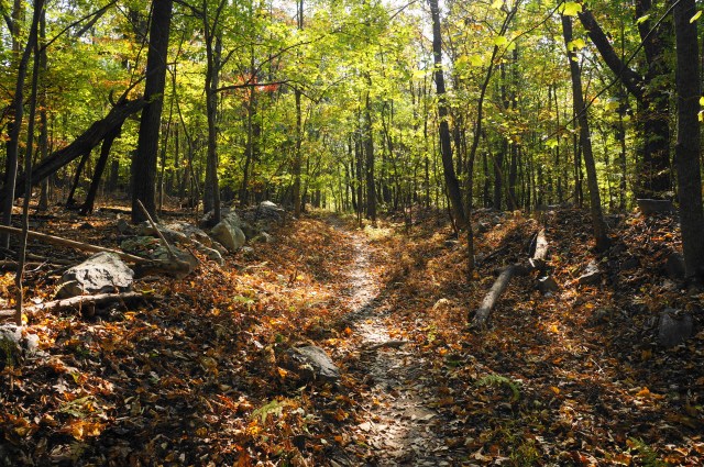 Continue up and around a shady multi-pronged ravine, following the contouring path up to Chestnut Hill Road and a set of power lines. Carefully cross and find the ascending trail continuing beyond, this time heading southwest before cutting east. Gaining 500 feet in the next half-mile, the relentless pitch leads eventually up to an unmarked spur with the Orange Trail, a connector to Split Rock. Stay right, climbing more gently to a second junction 2/10 mile farther on, passing an old roadbed along the way. At the fork, bear right, staying on the AT as the Blue Trail bears right, offering alternative access to the Split Rock overlook.
