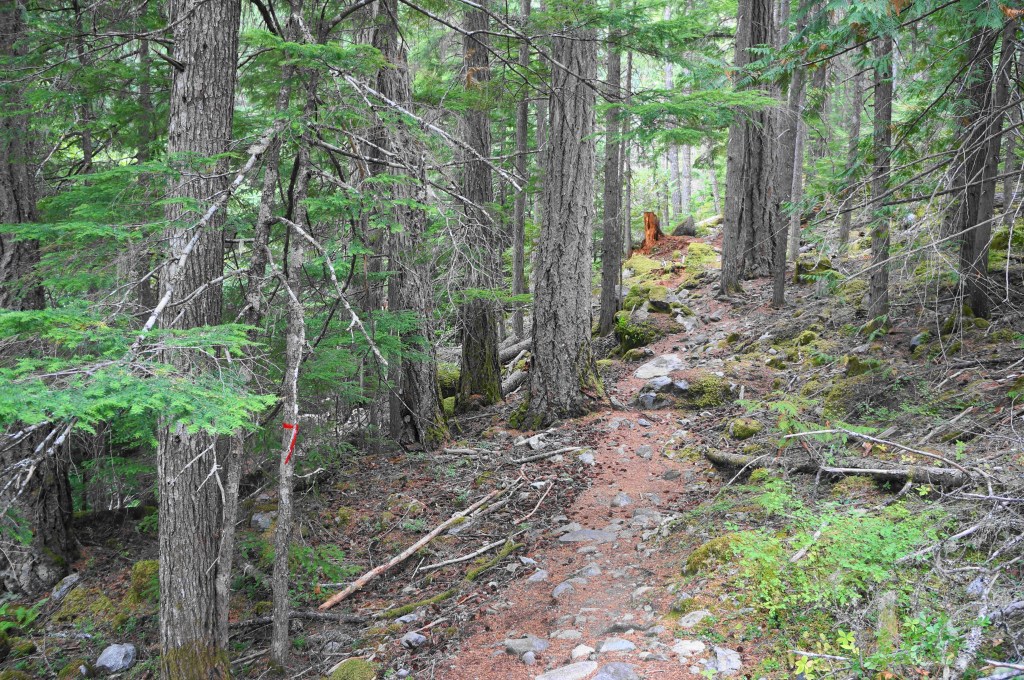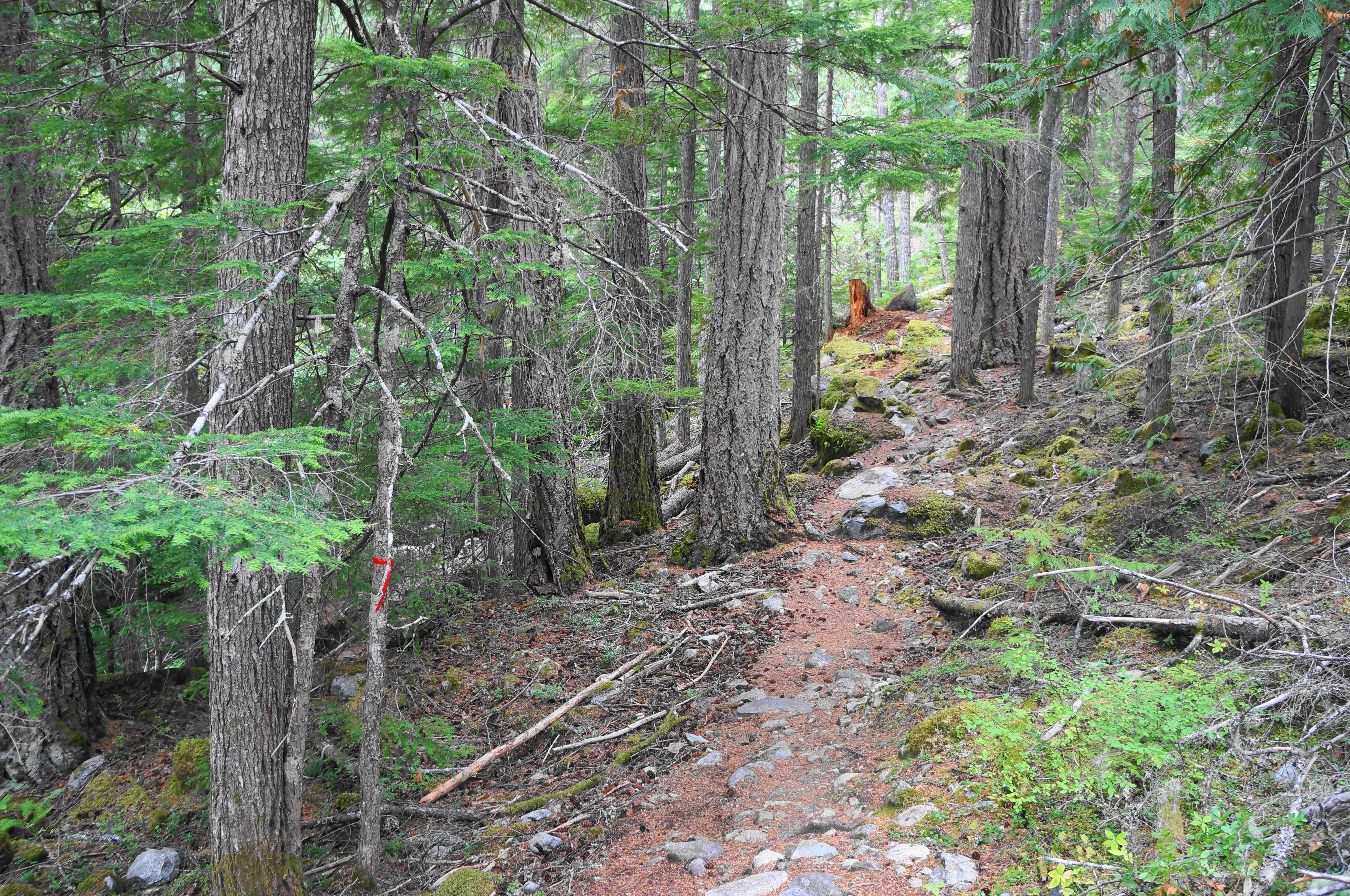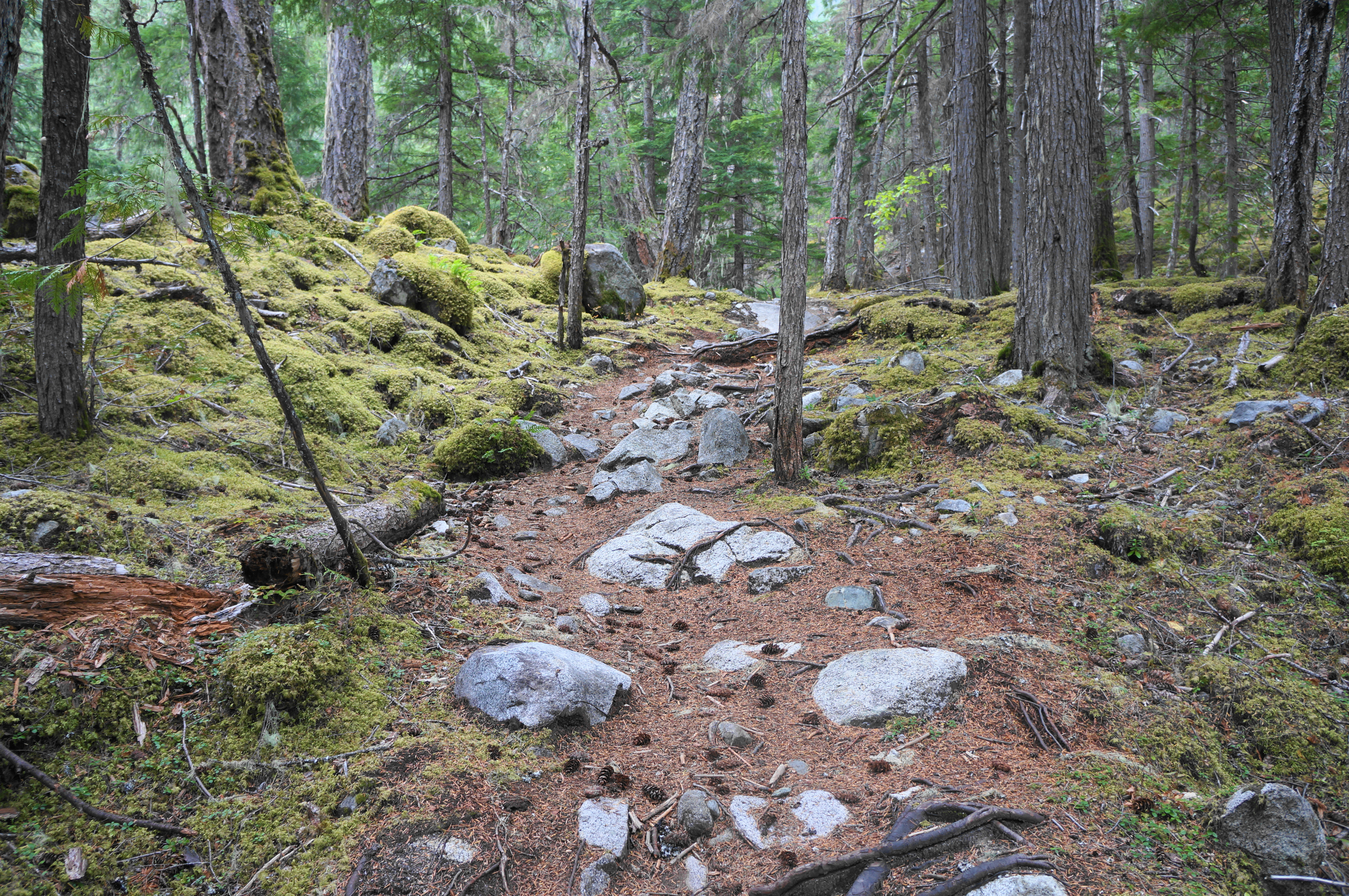 From the end of the road, head west on the Waterfall Trail as it drops to the Pemberton Creek drainage, a perennial mountain stream. Take either the switchbacking trail with wooden fencing or a creekside path over a short bridge up to a junction, where mountain bike trails come in from the right. Stay left but then keep on the lookout for a small sign for the Waterfall Trail, which—perhaps counterintuitively at first—winds well away from the creek’s edge. Follow the trail marked with red ties, avoiding the temptation to drop to a small bridge and more well-worn path below (this is an access route to the so-called “Fat Tug” bike trail). Instead bear left and ascend sharply, cresting an initial cut then finding the winding path as it snakes up around mossy knobs and through dense forest, ever ascending.