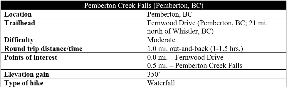 Imagine living in a quiet neighborhood, set in picturesque mountains, with what one visitor described as “the waterfall no one knows about” in one’s backyard. The town is Pemberton, British Columbia—a much more modest alternative to bustling Whistler—and the waterfall is Pemberton Creek Falls, a 200-foot double-shot chute. If it were set in a national park or near a major city, the site would be crawling with visitors. But for now the falls remains a somewhat hidden gem—and well worth the stout, ½-mile climb.